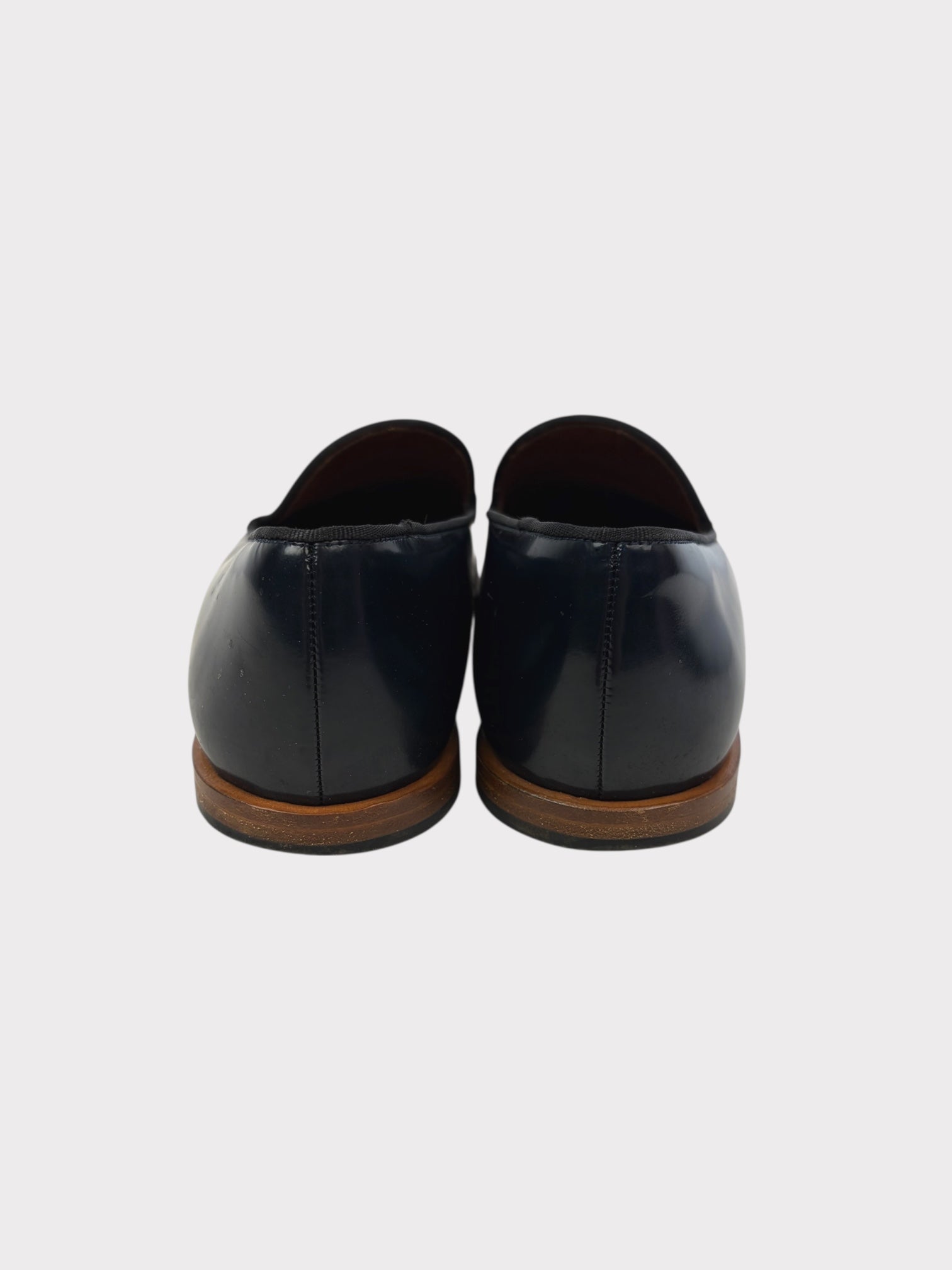 Black shiny slip on flat shoes with pointy toe and piping detail around opening