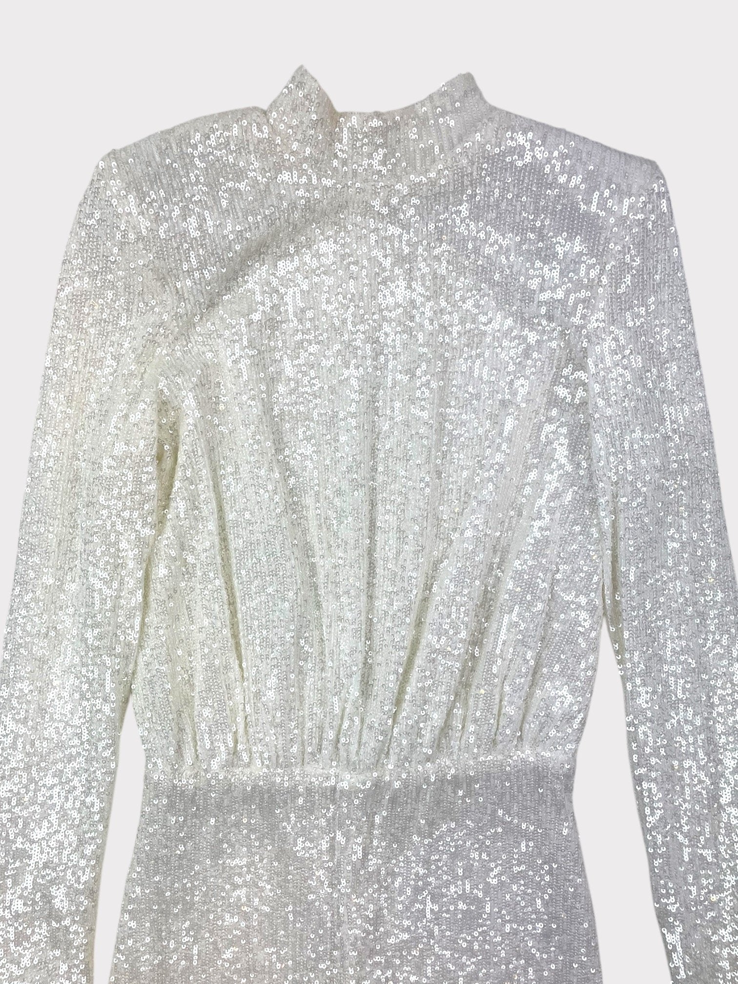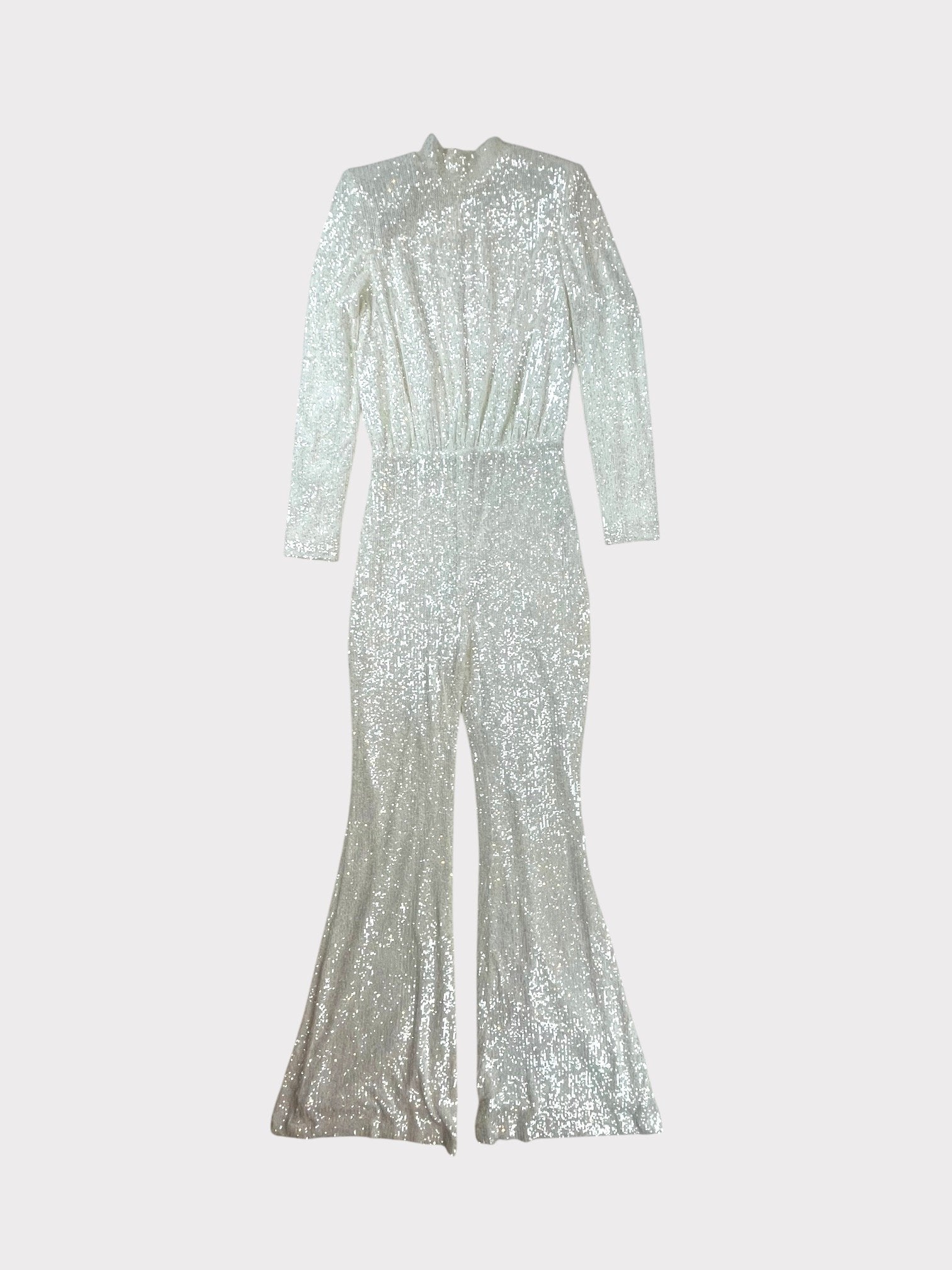 White sequin jumpsuit with shoulder pads and cut out detail at back