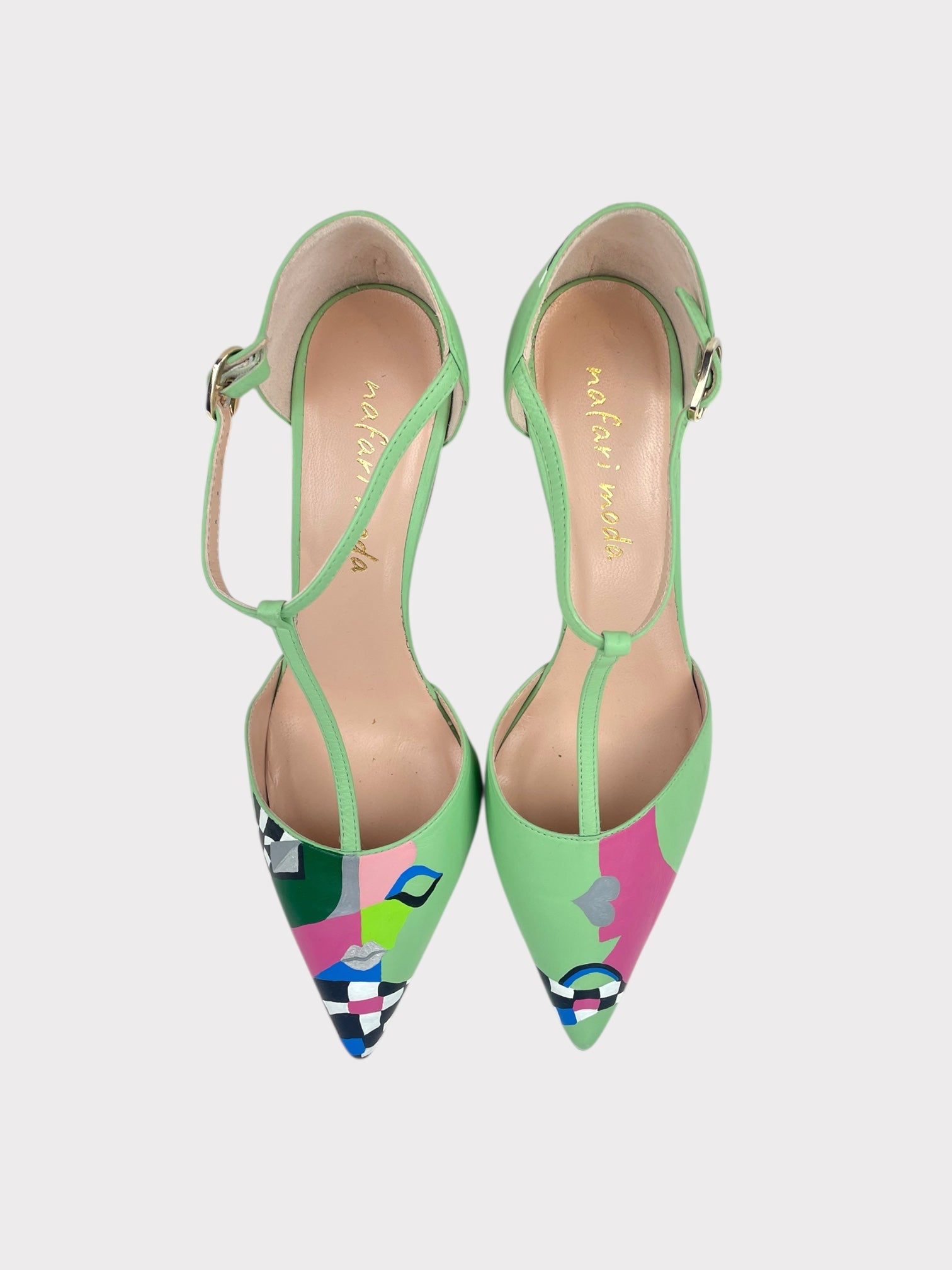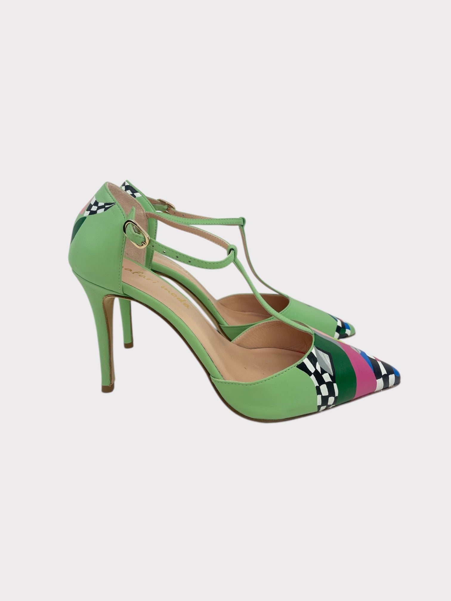 Light green leather pointy shoes with stiletto heels and hand painted design