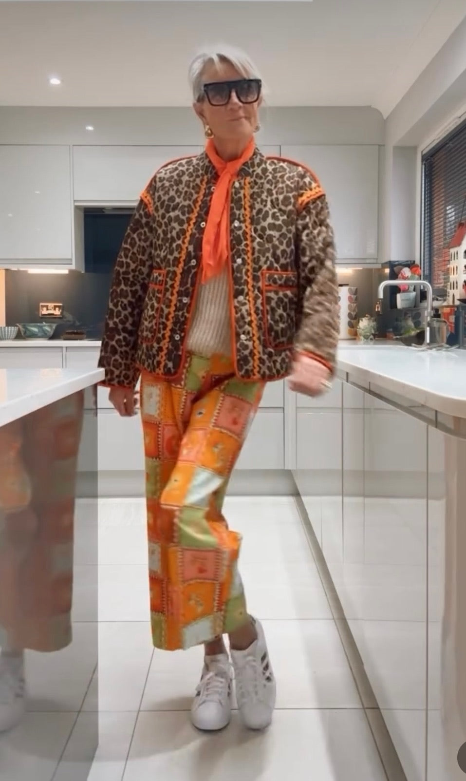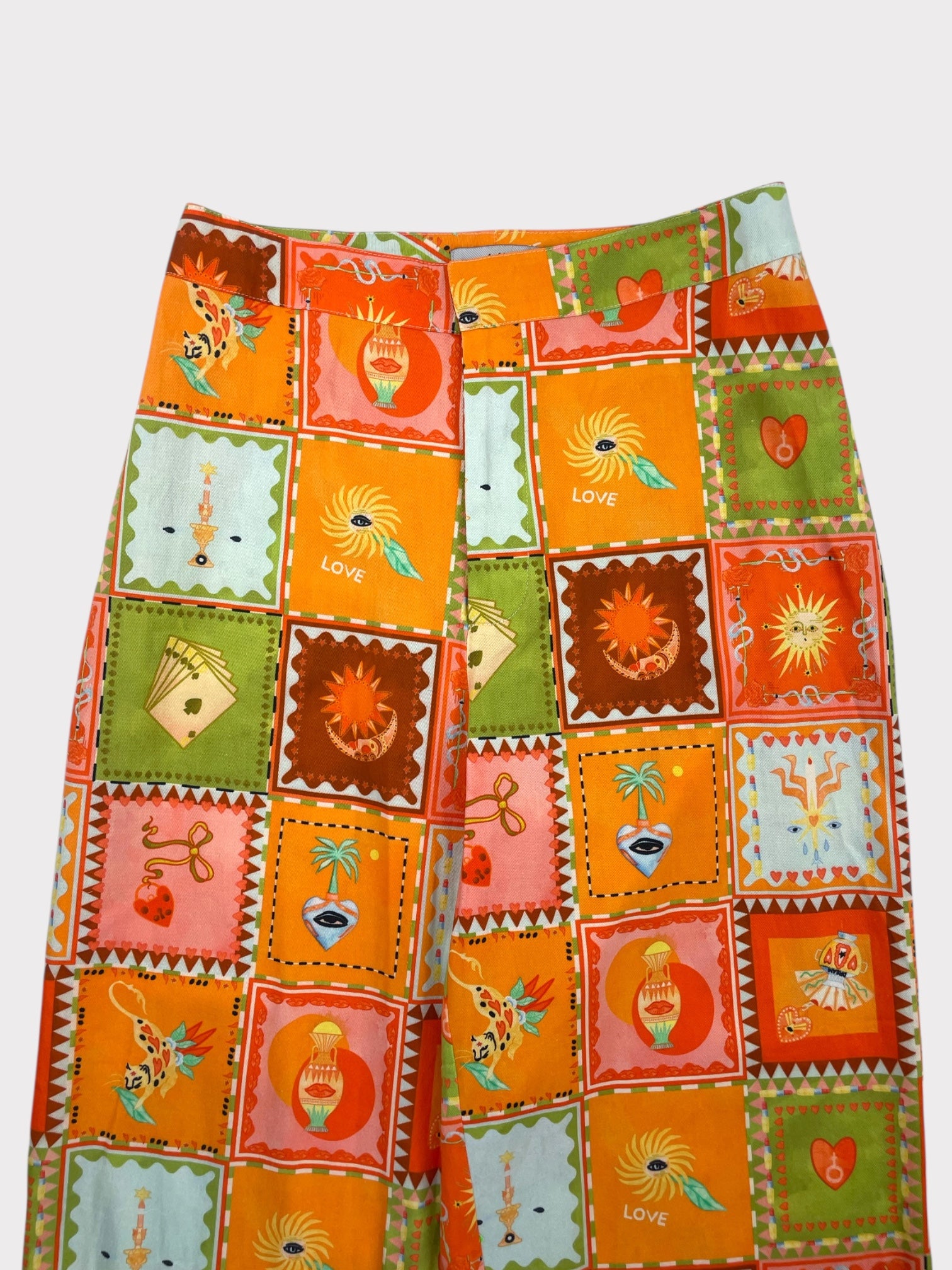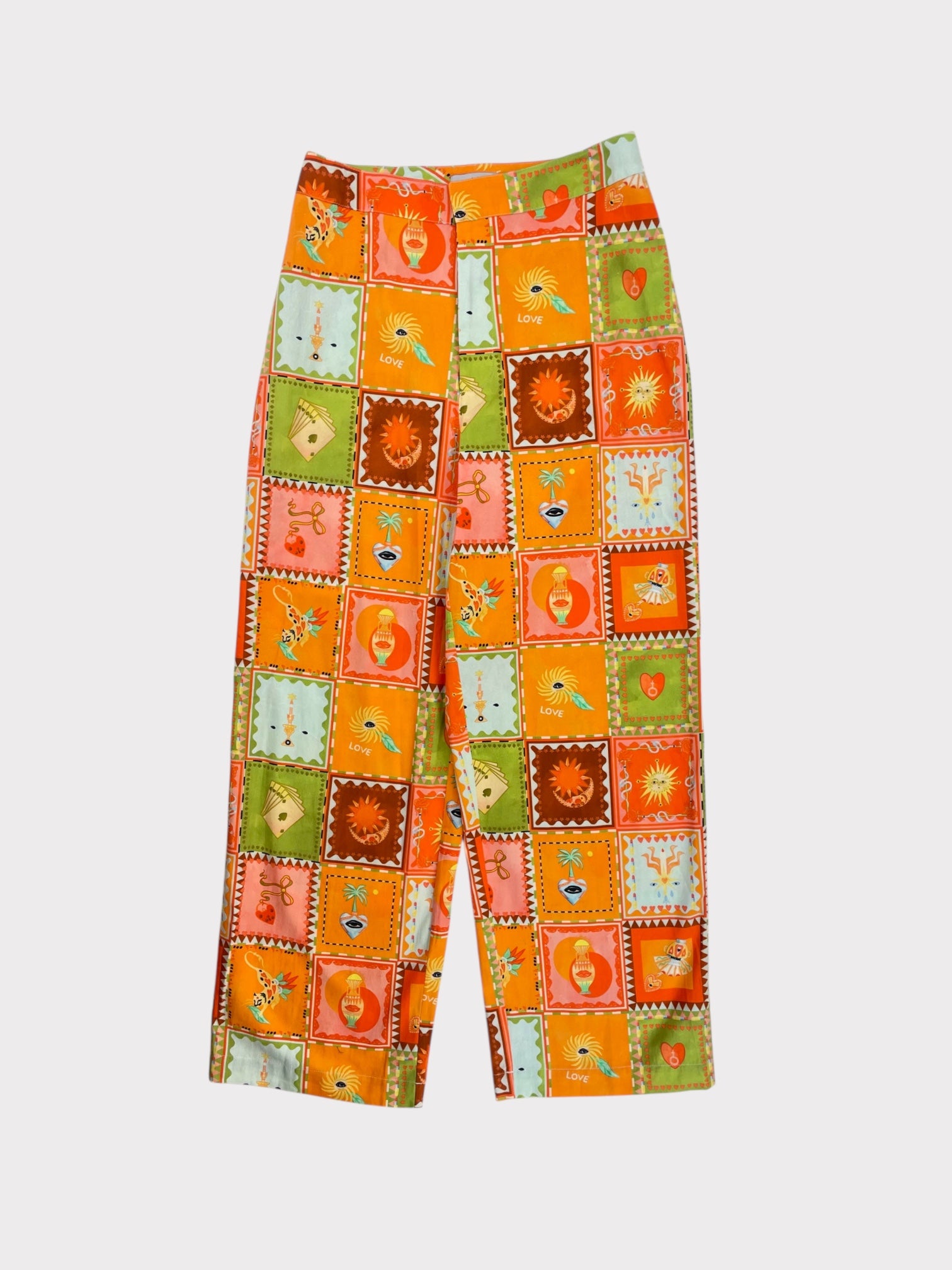 Bold, colourful printed straight leg trousers with zip fly and pockets