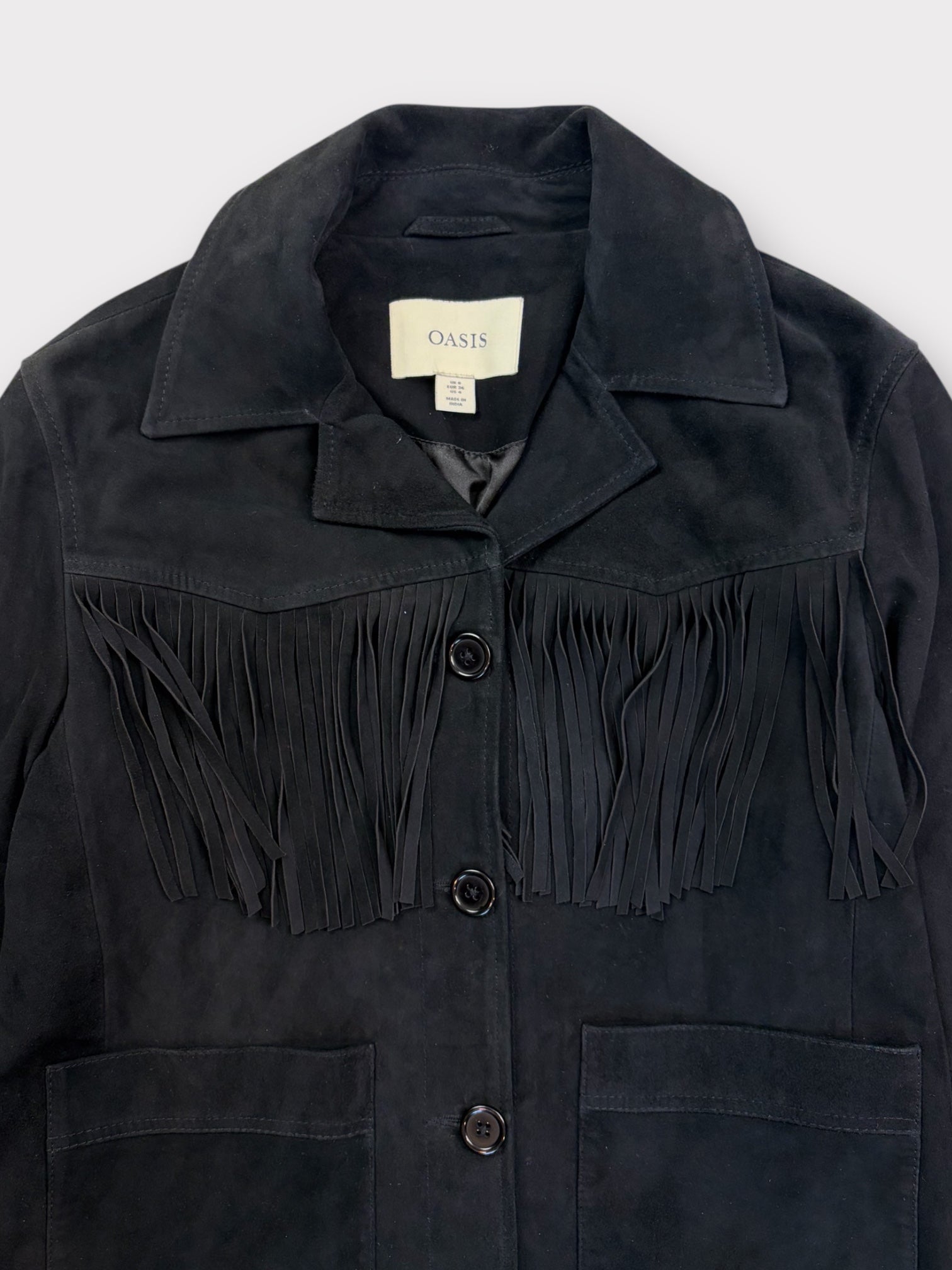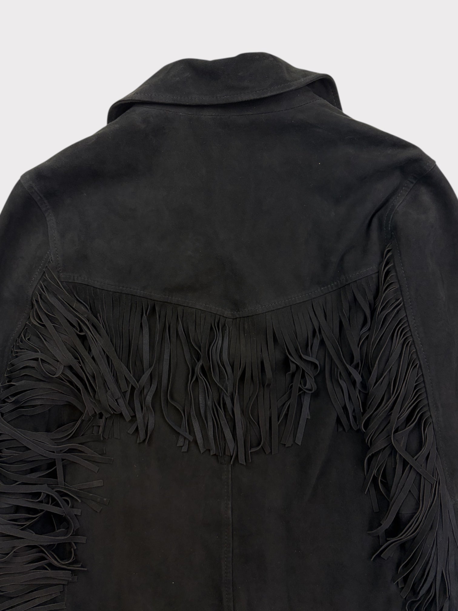 Black suede jacket with fringing detail down sleeves, across the back and chest