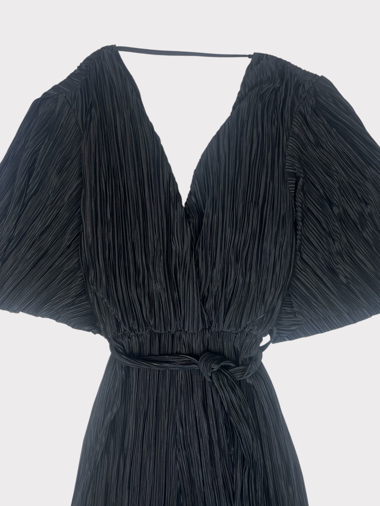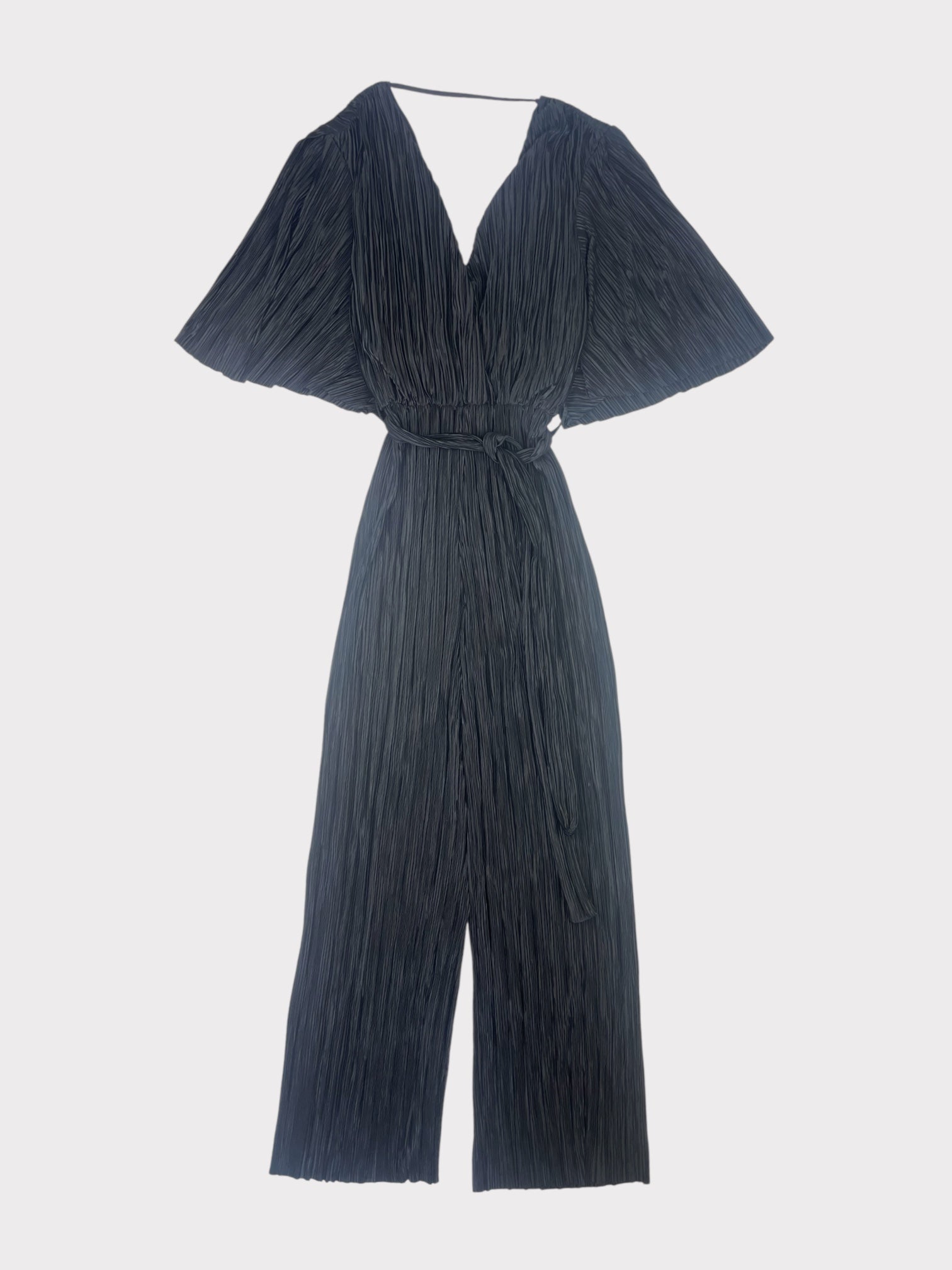 Black plisse wide leg jumpsuit with deep v neck at front and back with strap detail