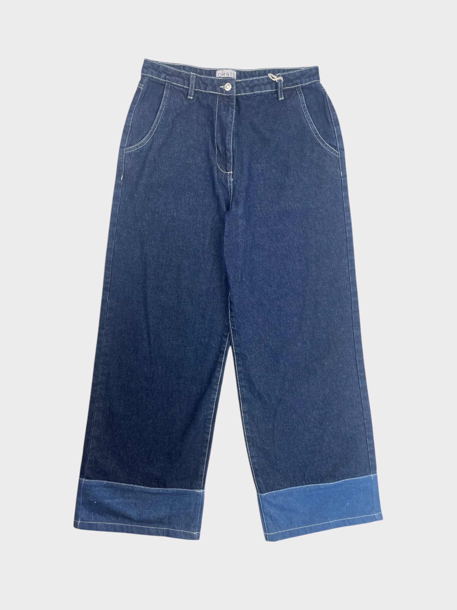 Dark denim wide leg jeans with contrasting panels at hem and contrasting pockets