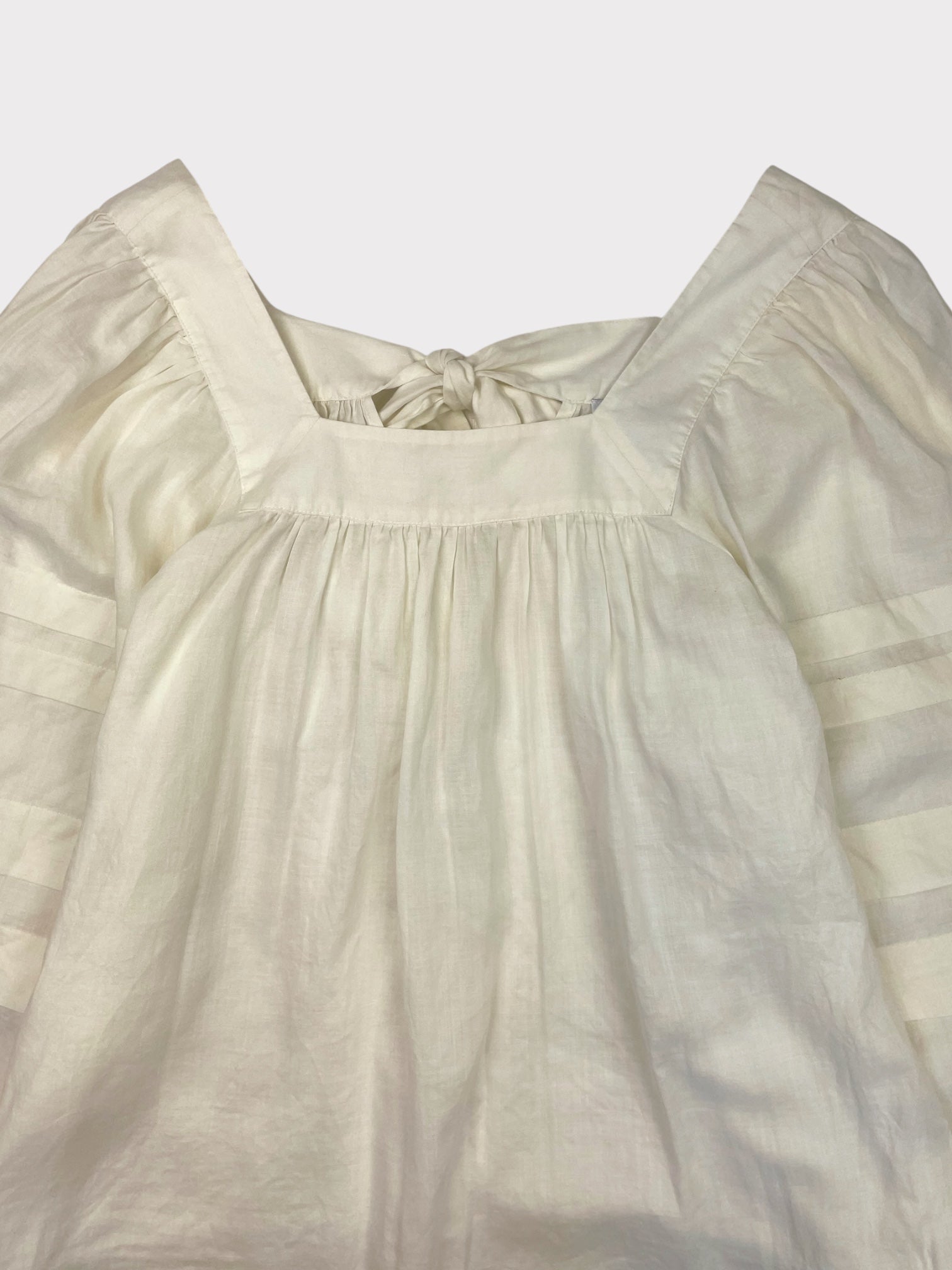 White top with square neckline and long blouson sleeves