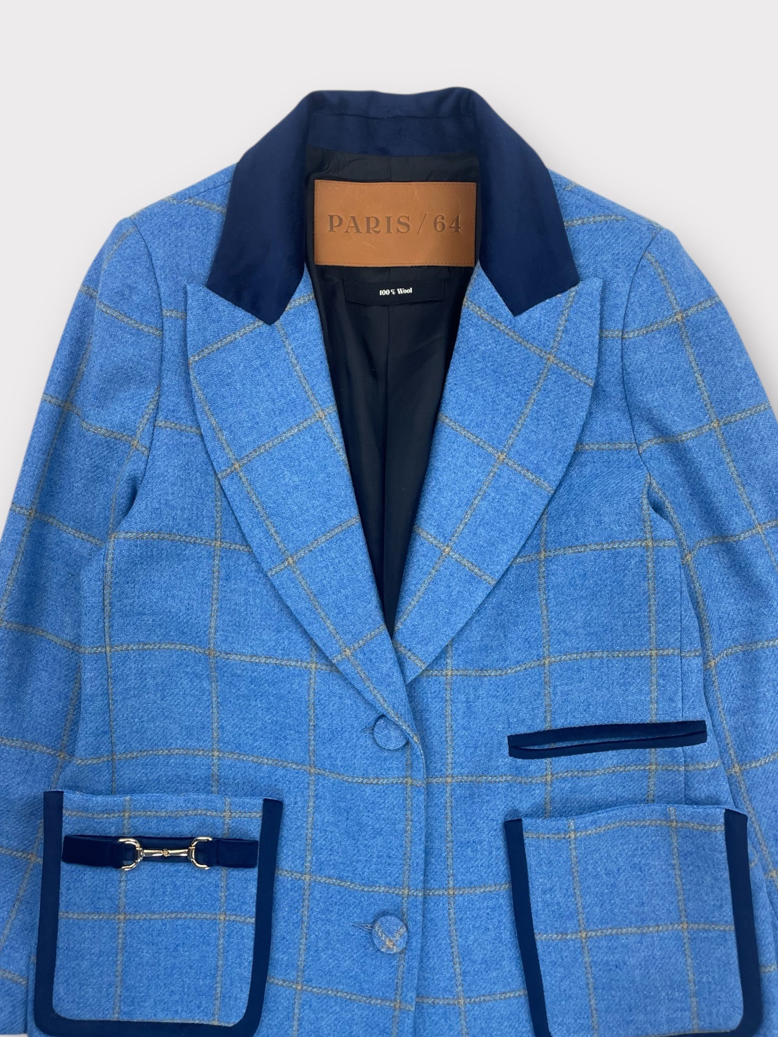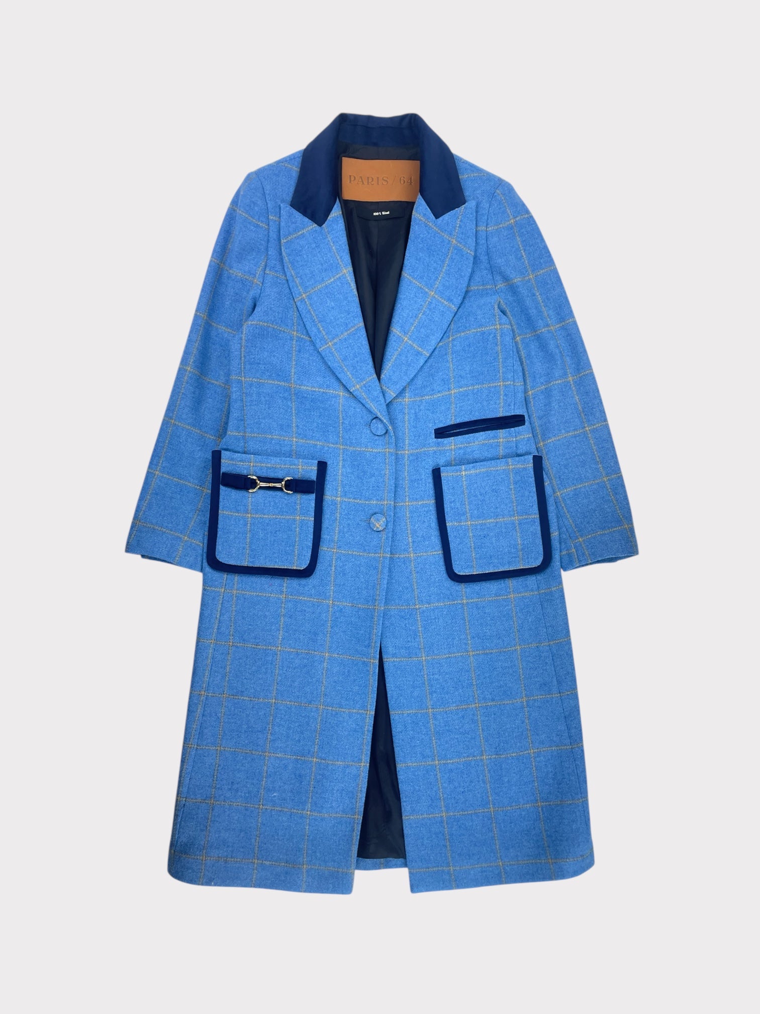 Blue checked midi length wool coat with navy velvet details and padded shoulders