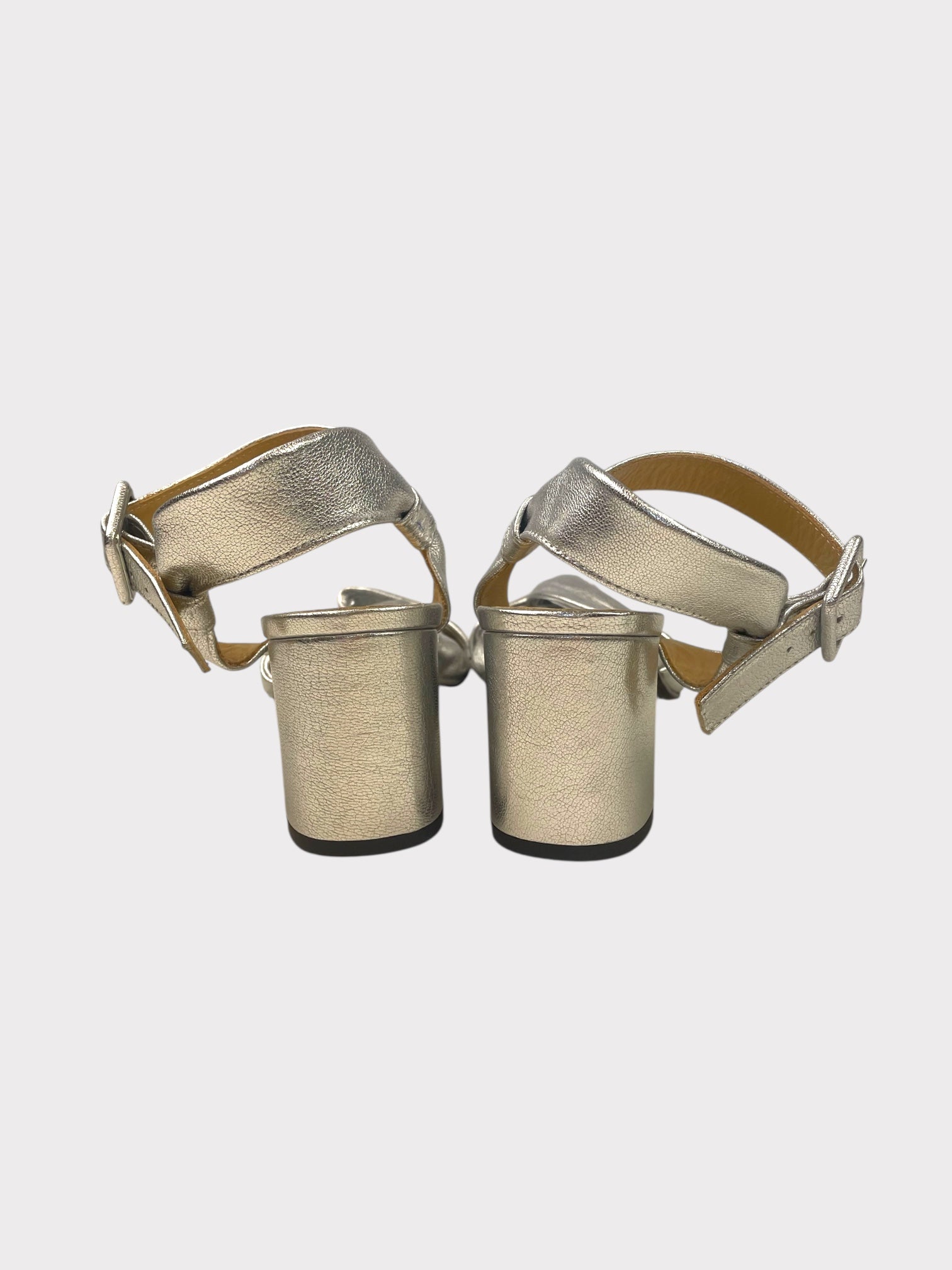 Metallic silver cross over detail sandals with ankle strap and block heel