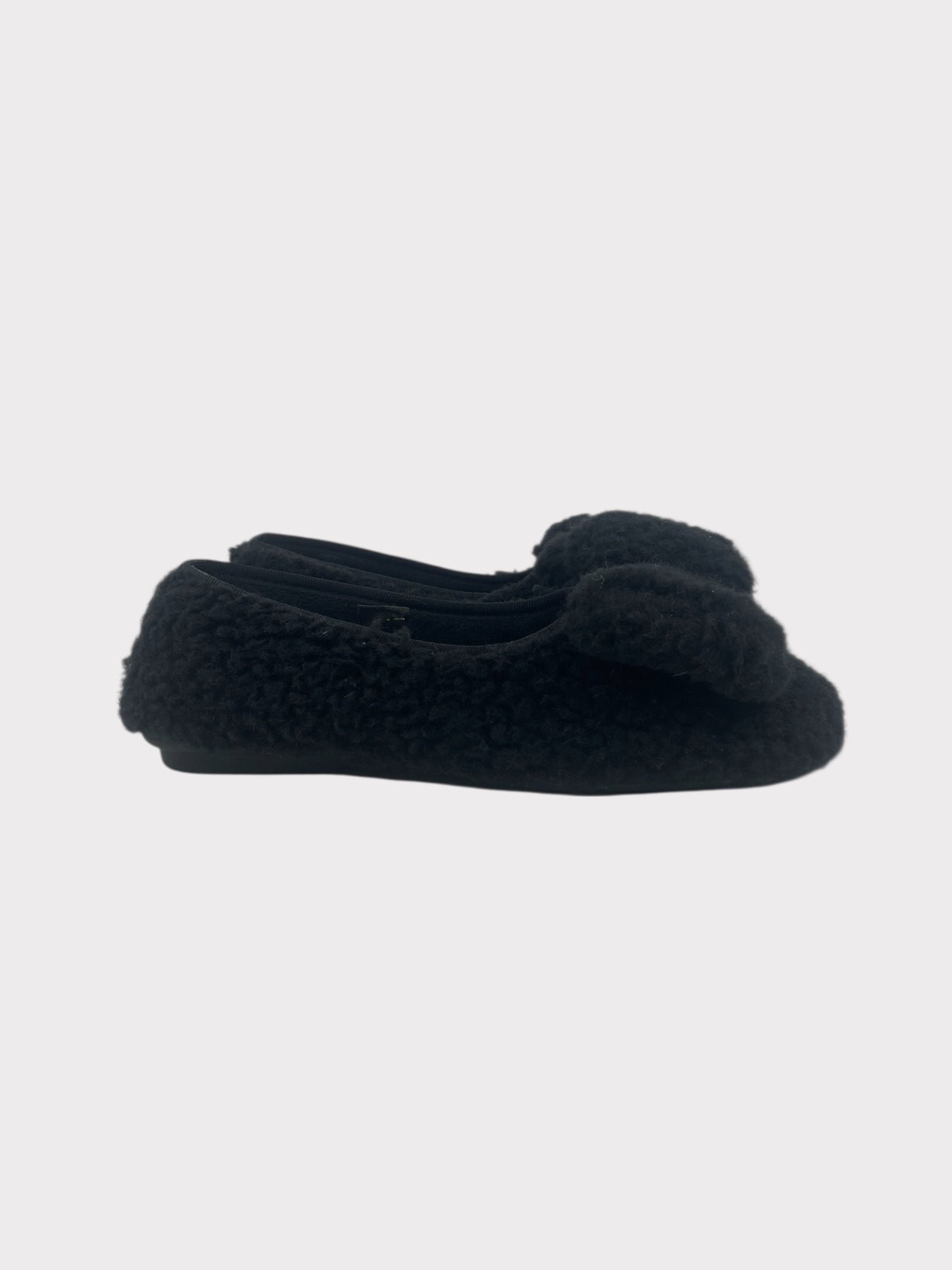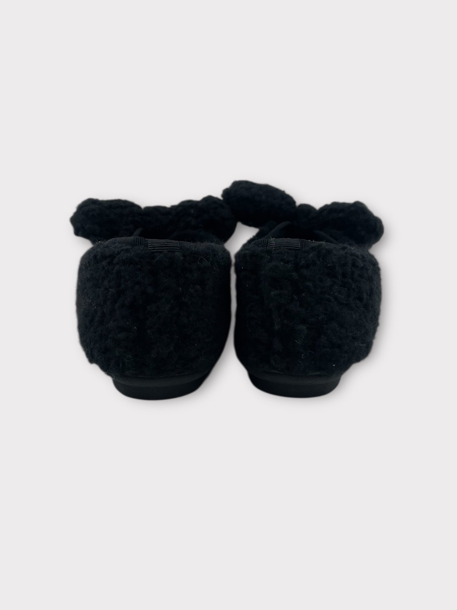 Black shearling ballet style slippers with large bow detail