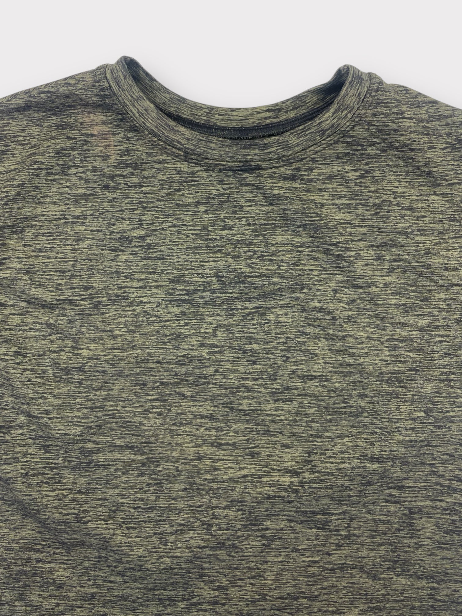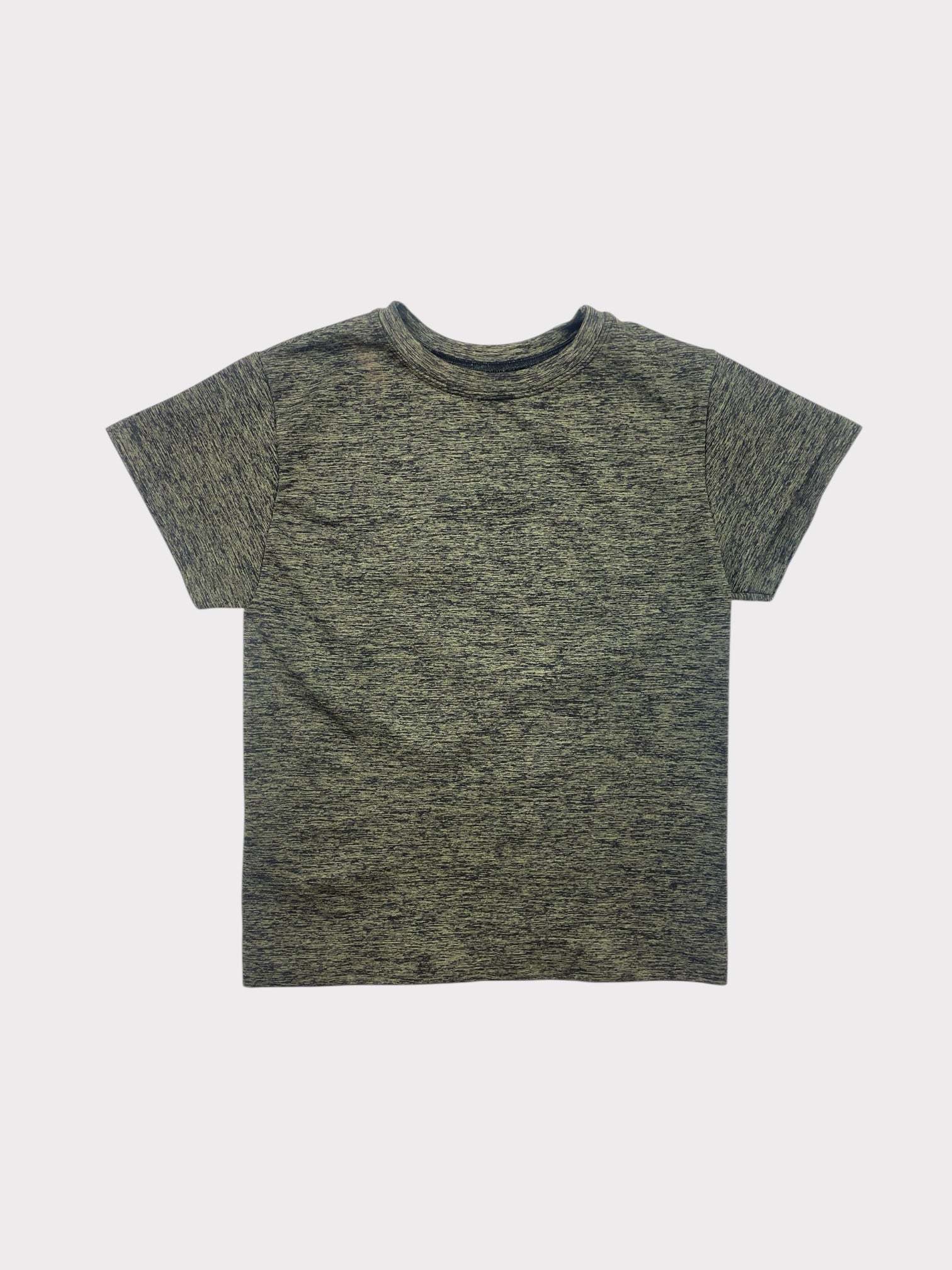 Khaki and black marled short sleeved crew neck t shirt finishing at the lower waist and with cap sleeves.