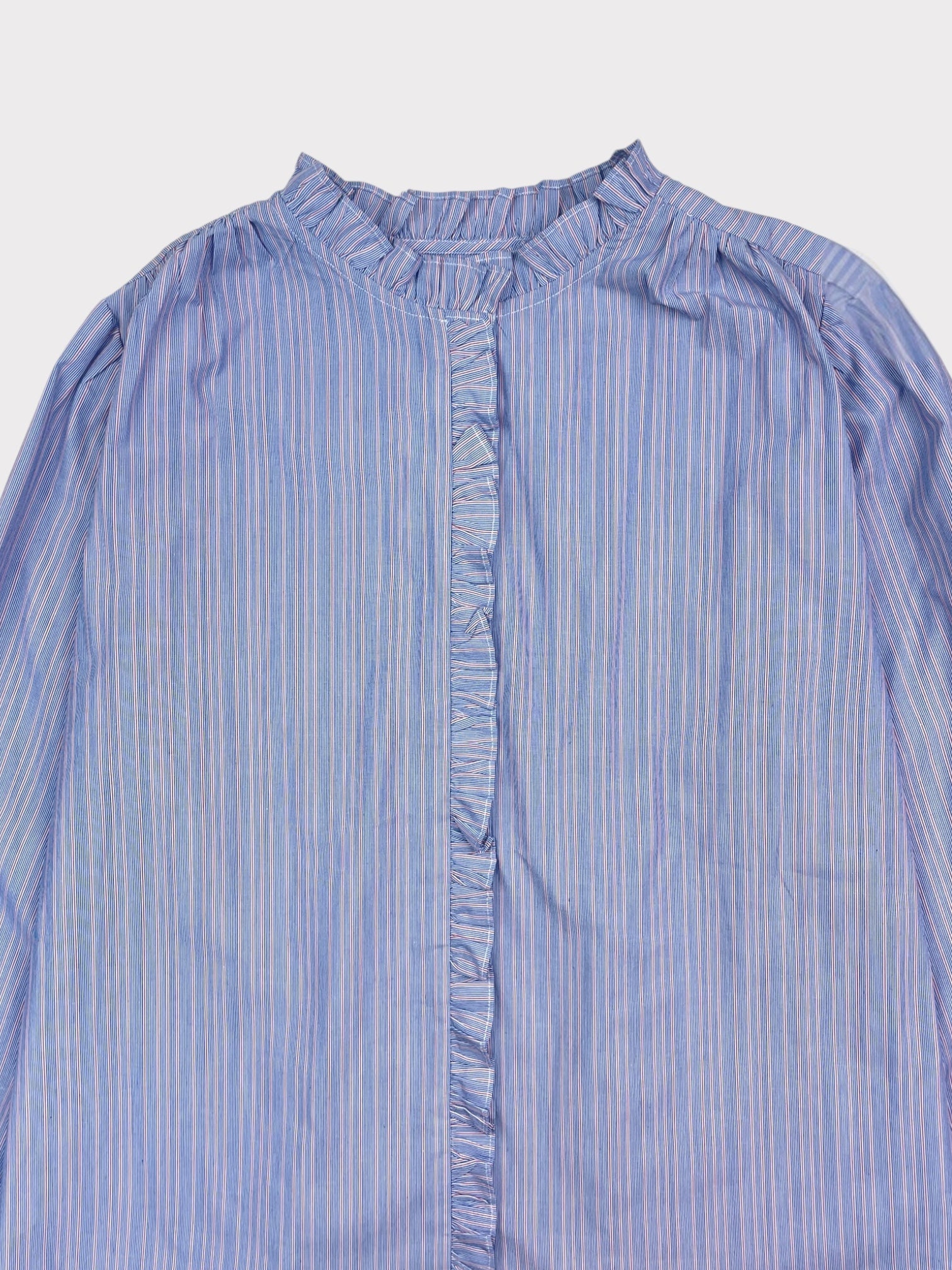 Blue, red and white fine striped shirt with frilled collar and frill detail down centre front