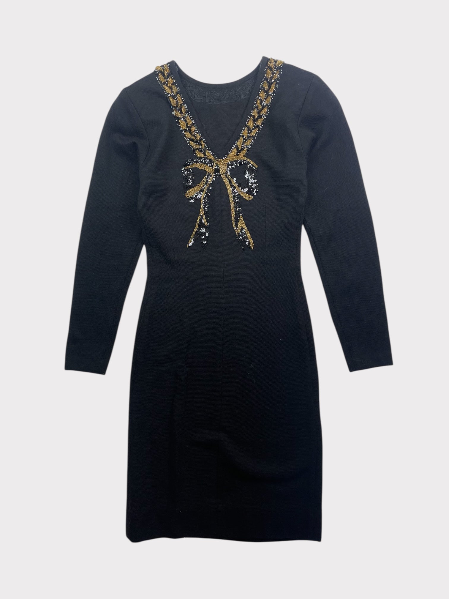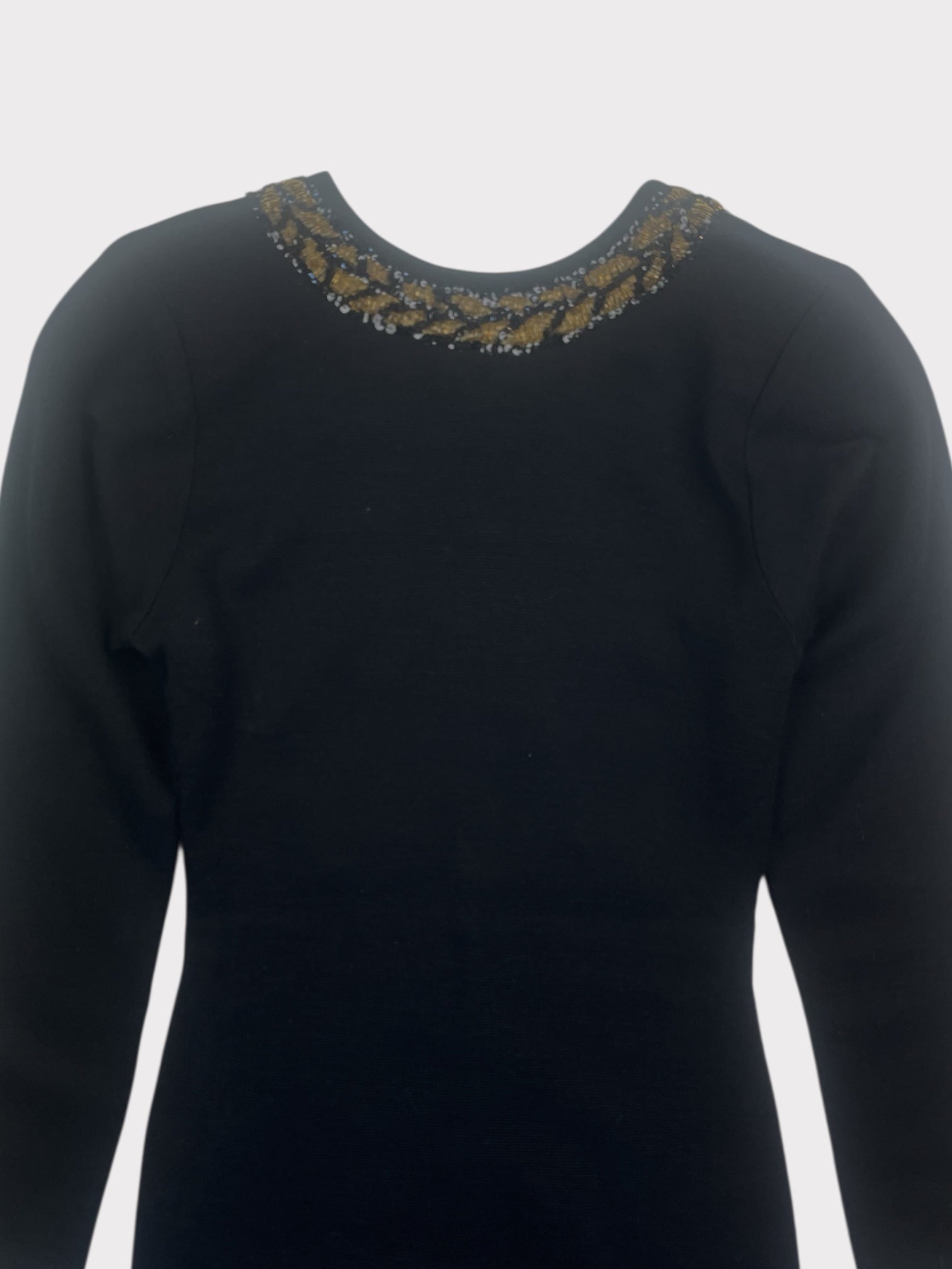 Black knitted long sleeve mini dress with shoulder pads beaded embellishment around neckline