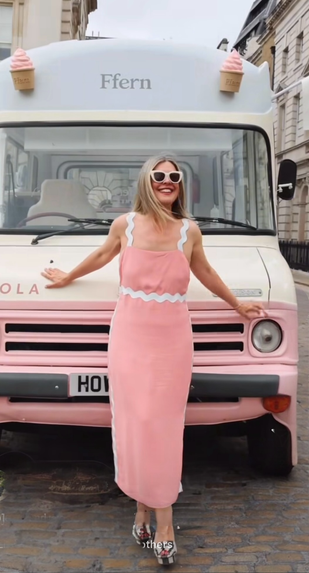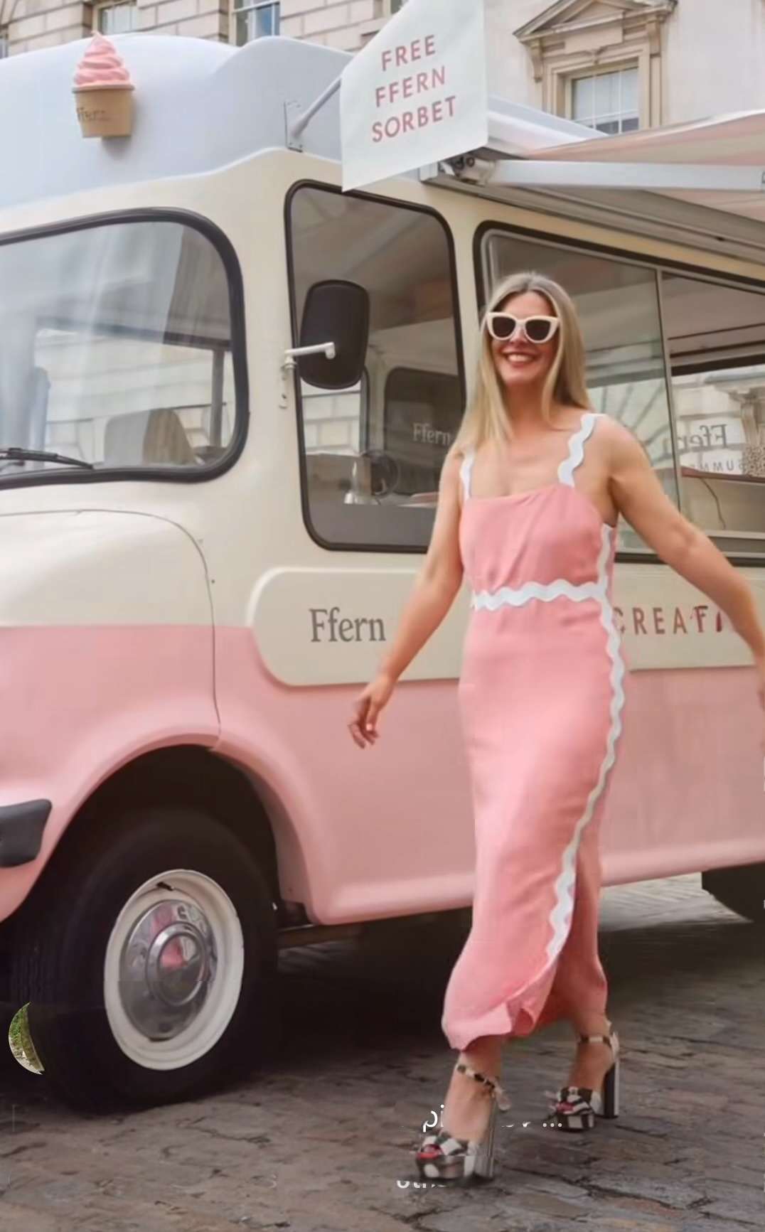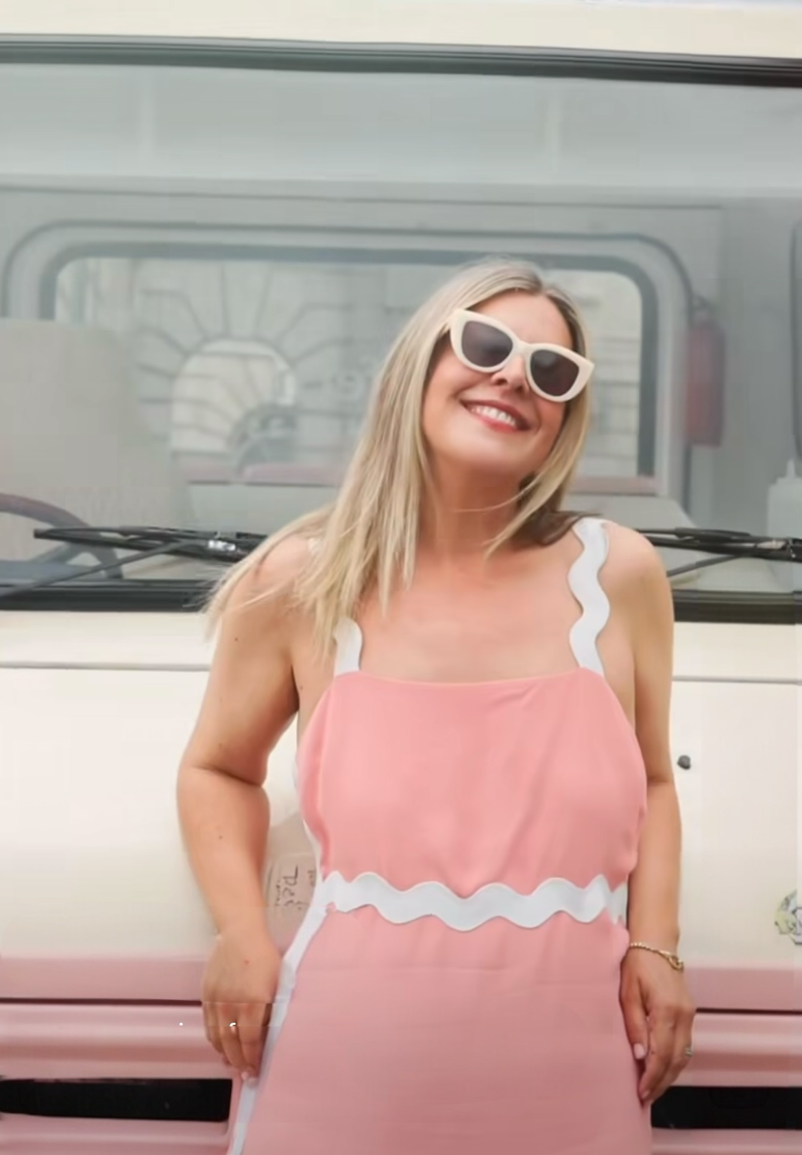 Pink maxi dress with white wide rib-rac straps and trim around waist and down side seams