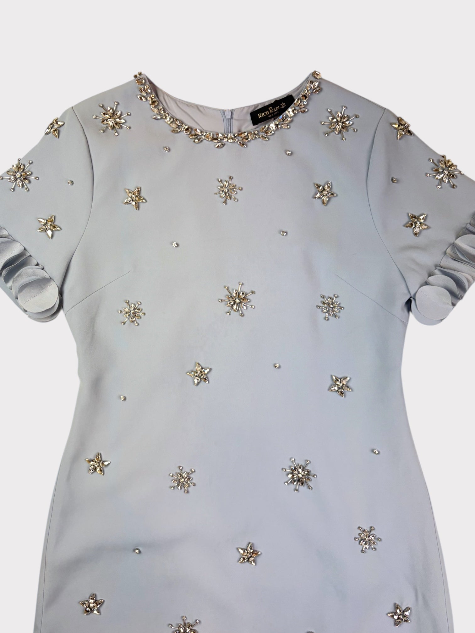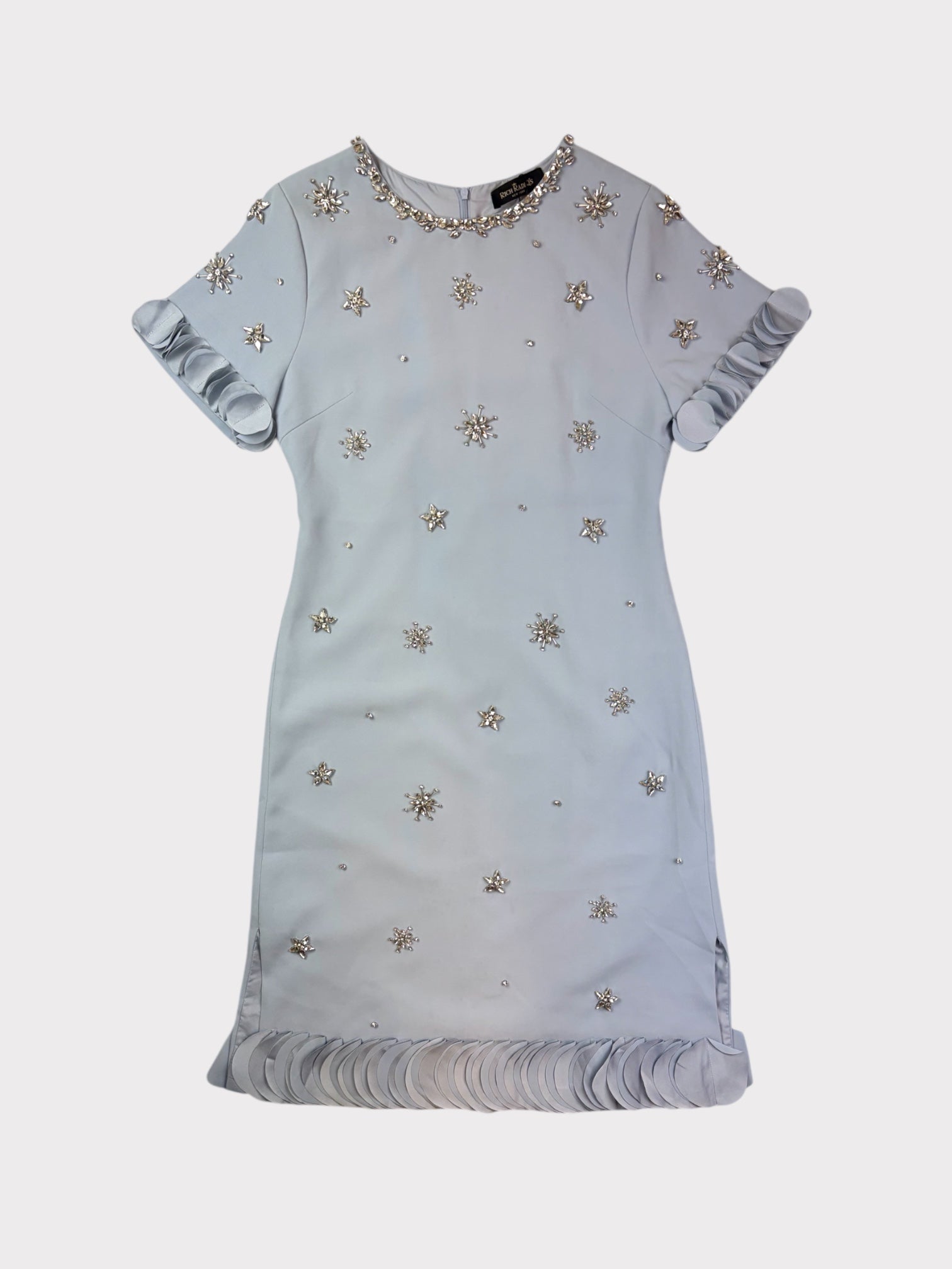 Pale blue short sleeved midi dress with jewelled embellishments around neckline and front of dress