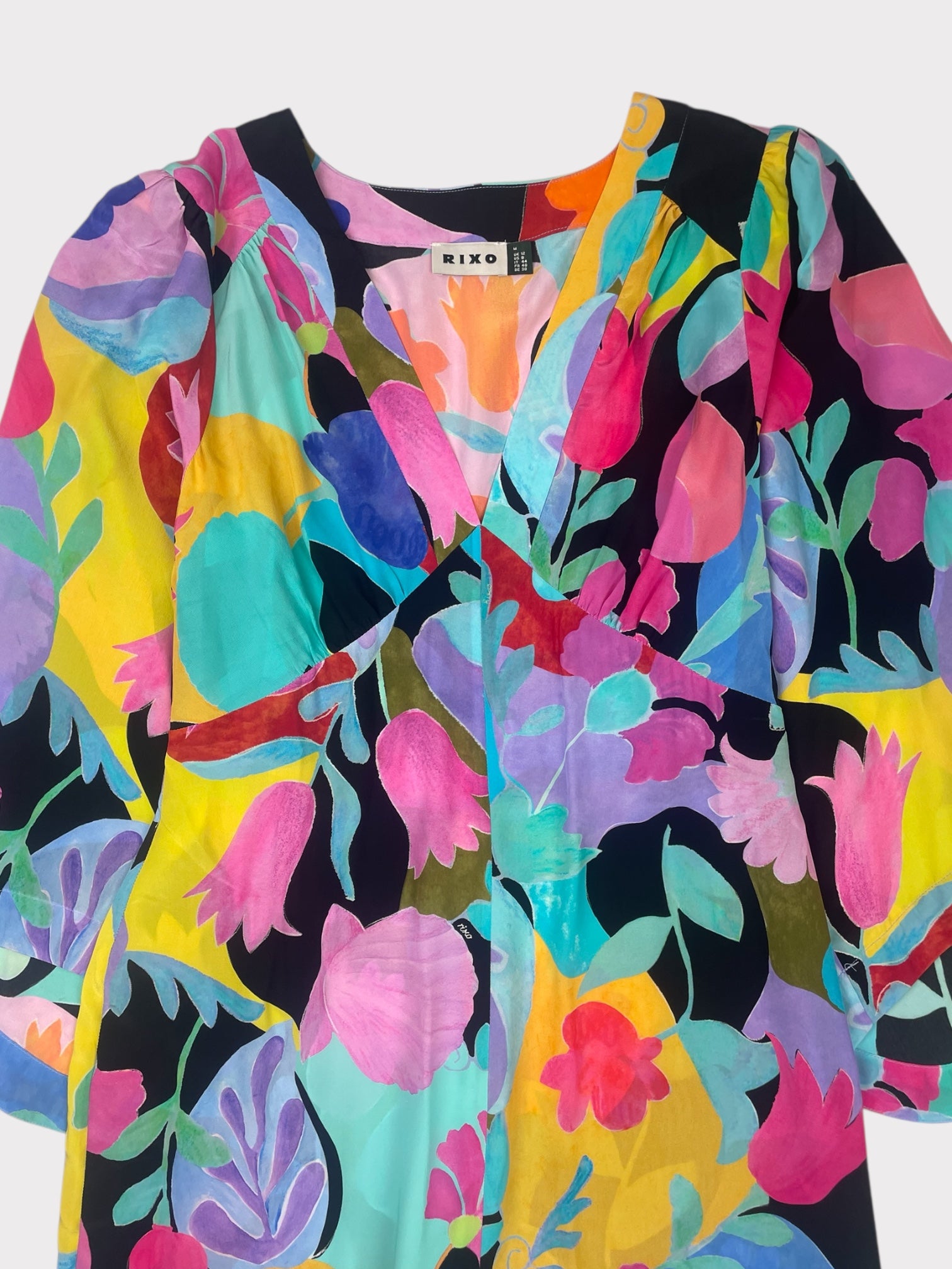 Bold multicolored floral silk dress with v-neck and wide long sleeves