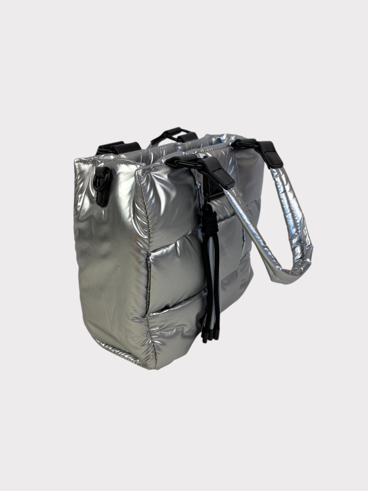 Metallic silver puffy woven mini tote bag with grab handles and detachable cross body strap and hanging tassel detail