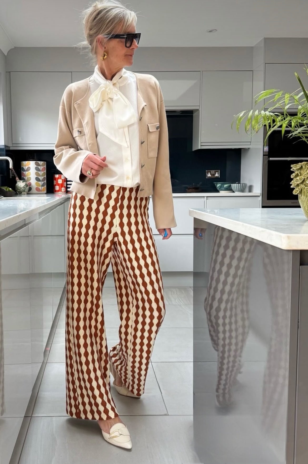 Light beige knitted jacket cardigan with silver branded buttons and pockets