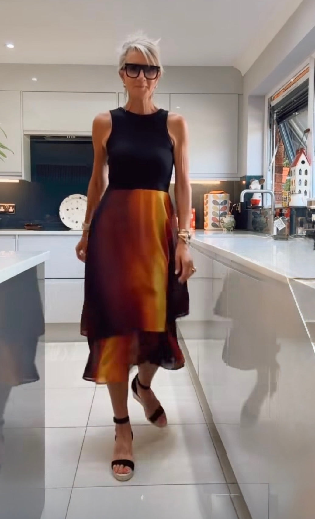 Maxi dress with black ribbed vest style top and printed chiffon layered skirt