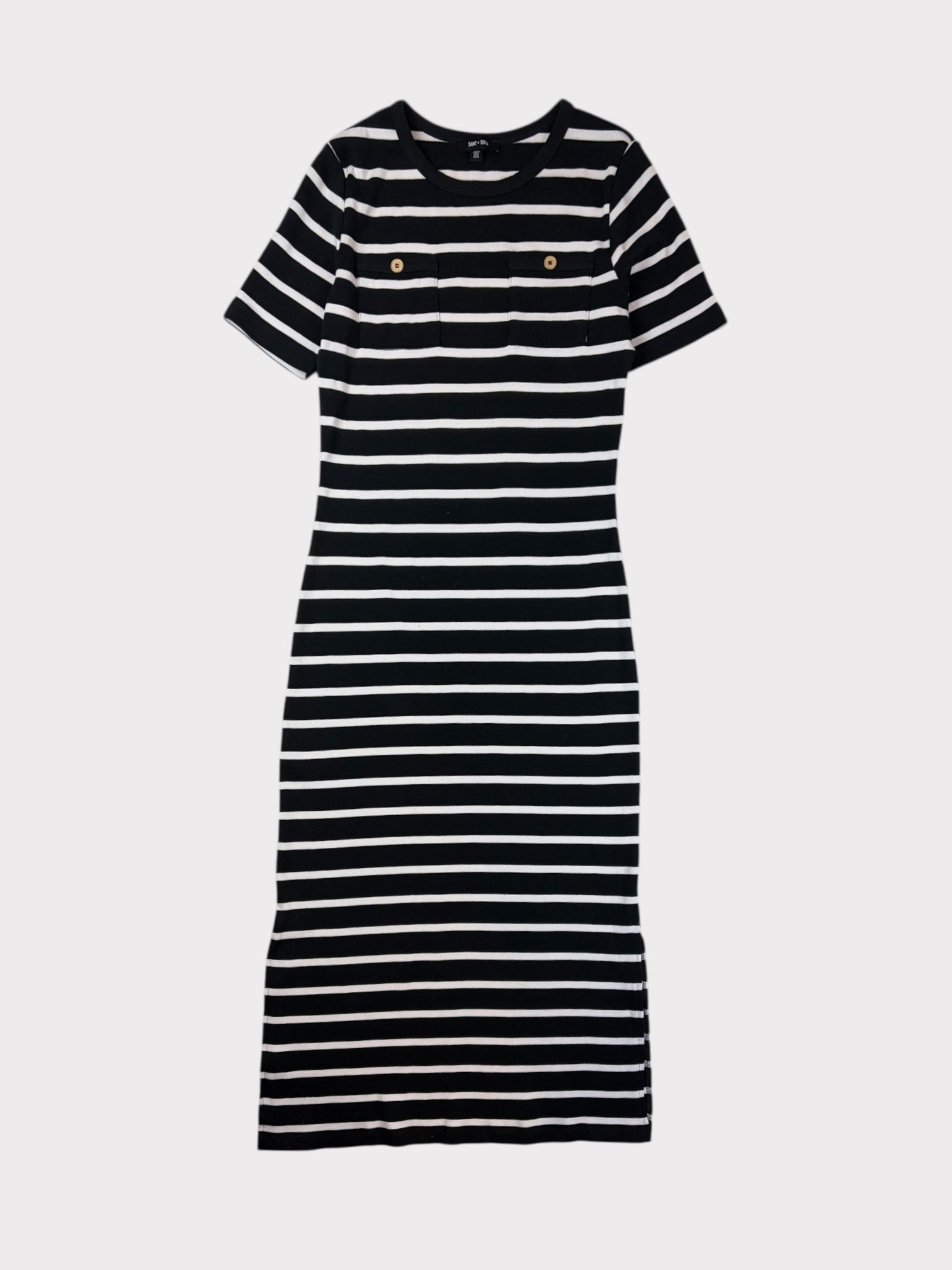Black and white striped jersey maxi dress with short sleeves and pocket detail at chest
