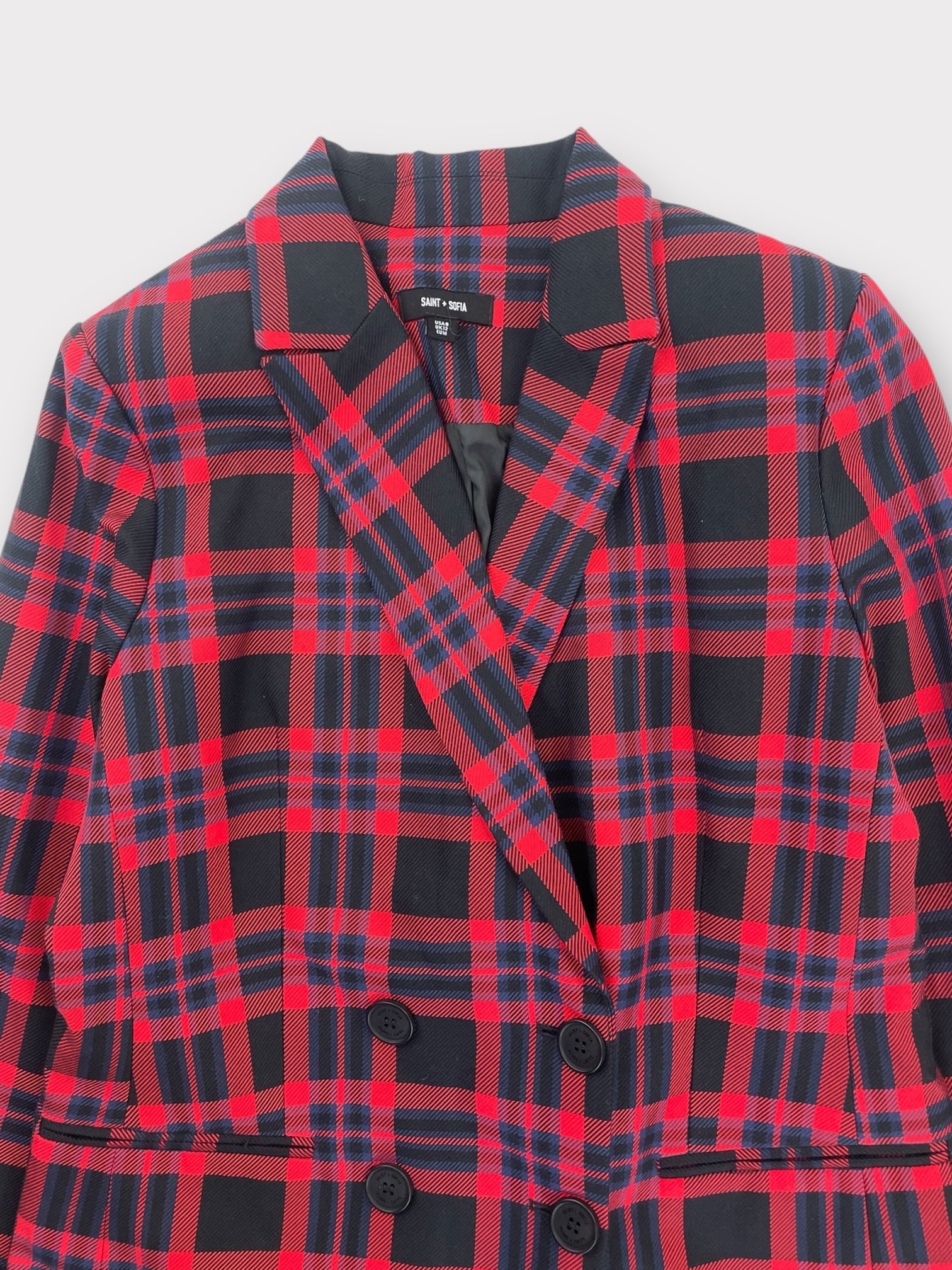 Red, black and navy checked double breasted blazer with classic collar and lapels