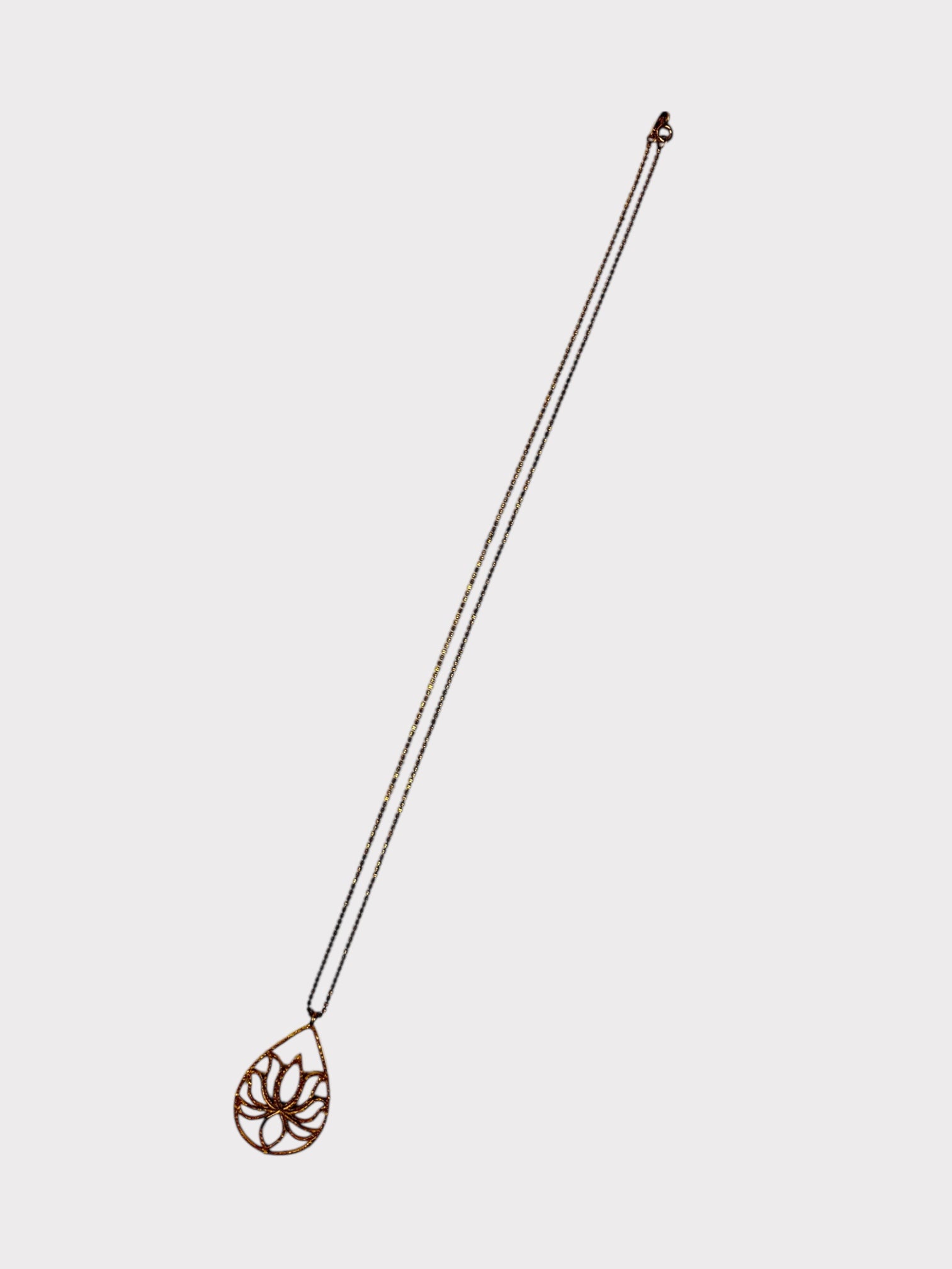Gold tone fine ball chain with hammered teardrop lotus pendant