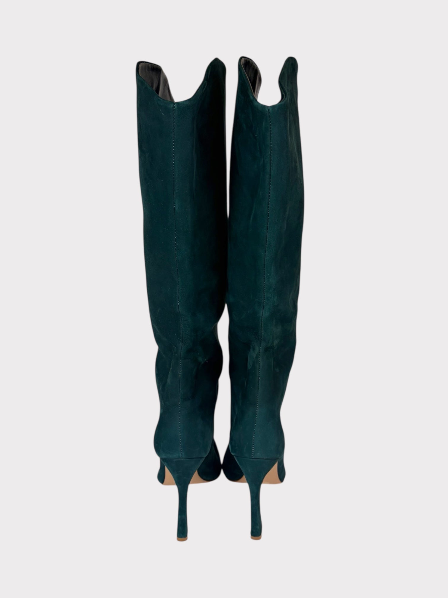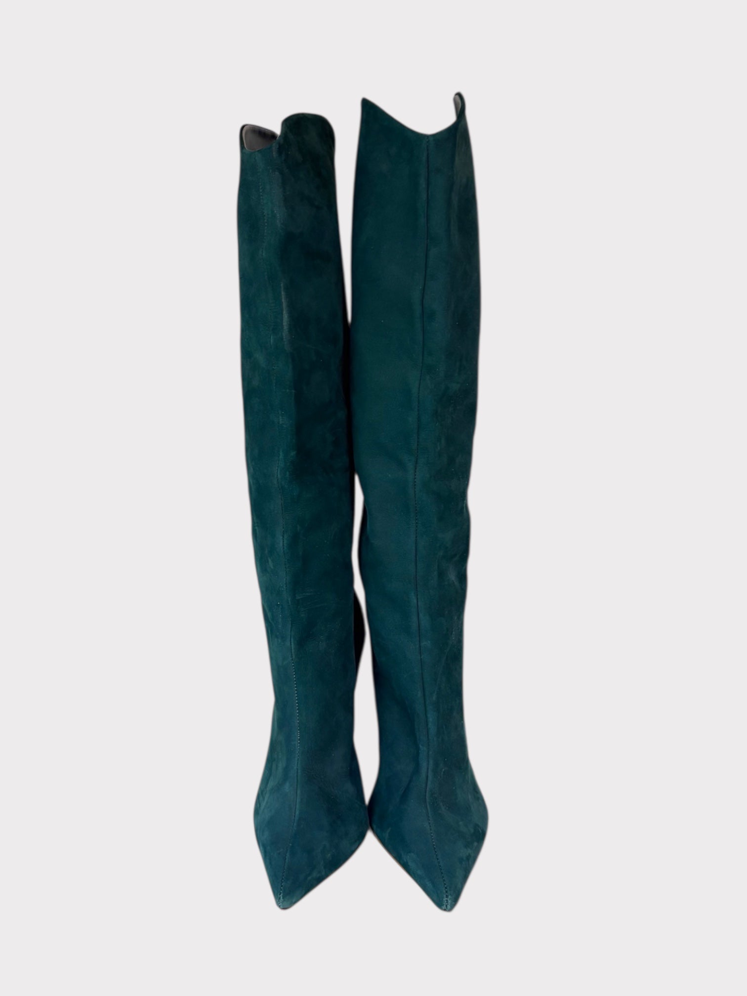 Dark green suede pointy knee high boot with shaped high stiletto style heel