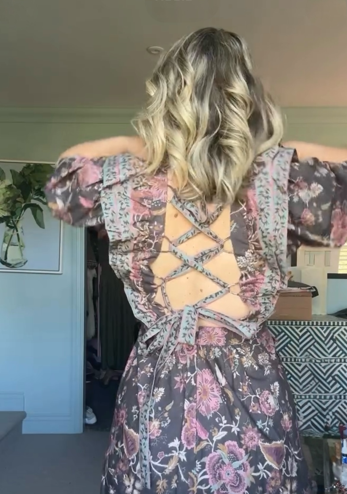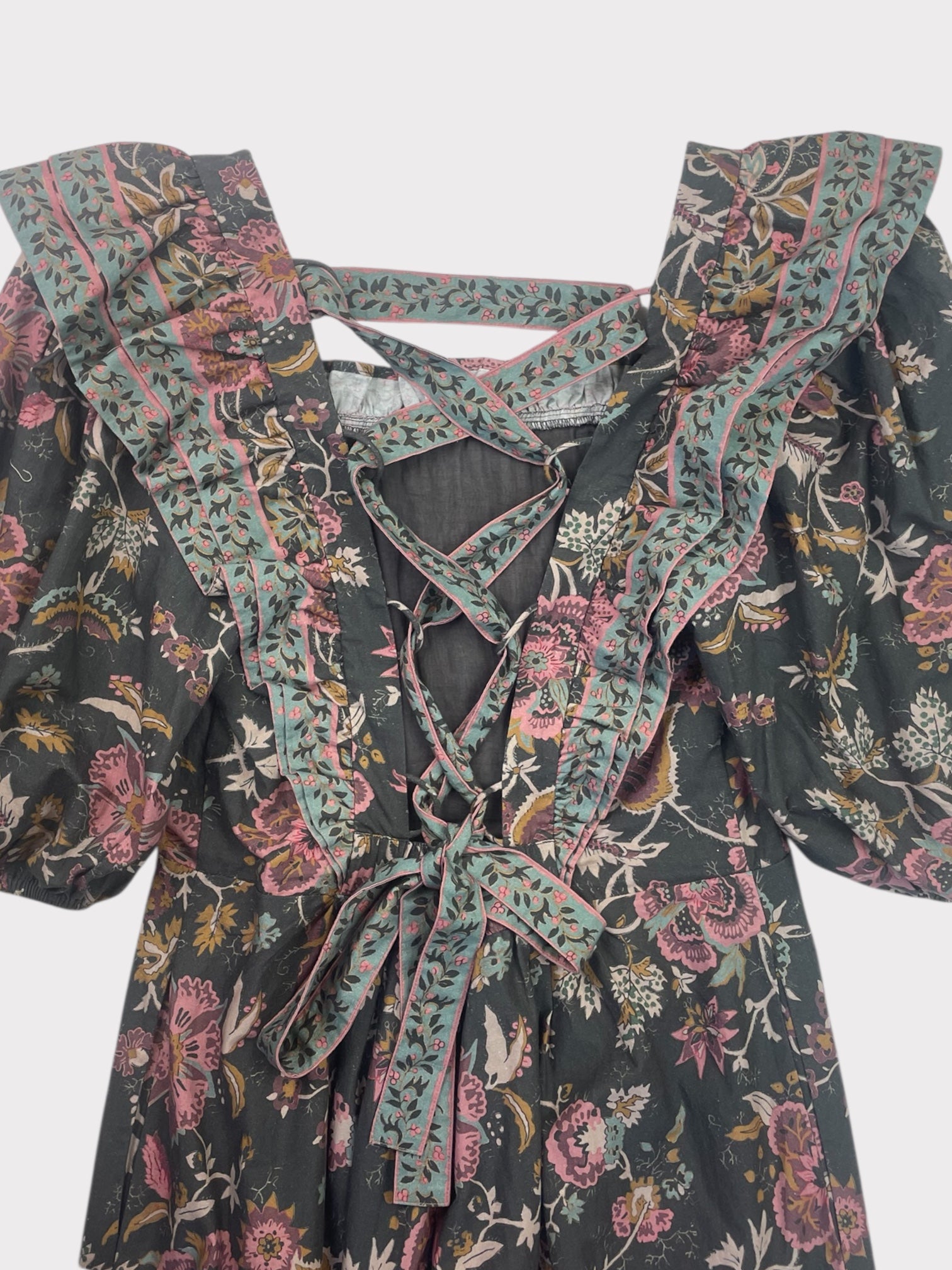 Dark grey floral maxi dress with 3/4 length puff sleeves and smocking and frill detail around bodice