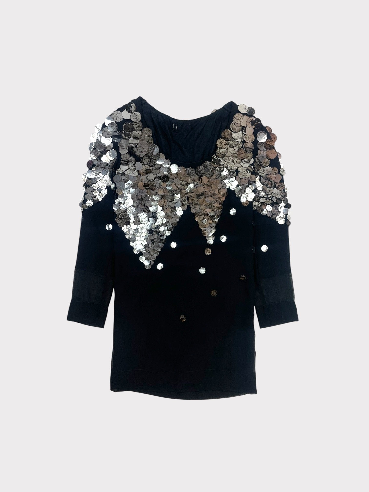 Black sheer shift dress with distressed disc sequins around neckline and sleeves