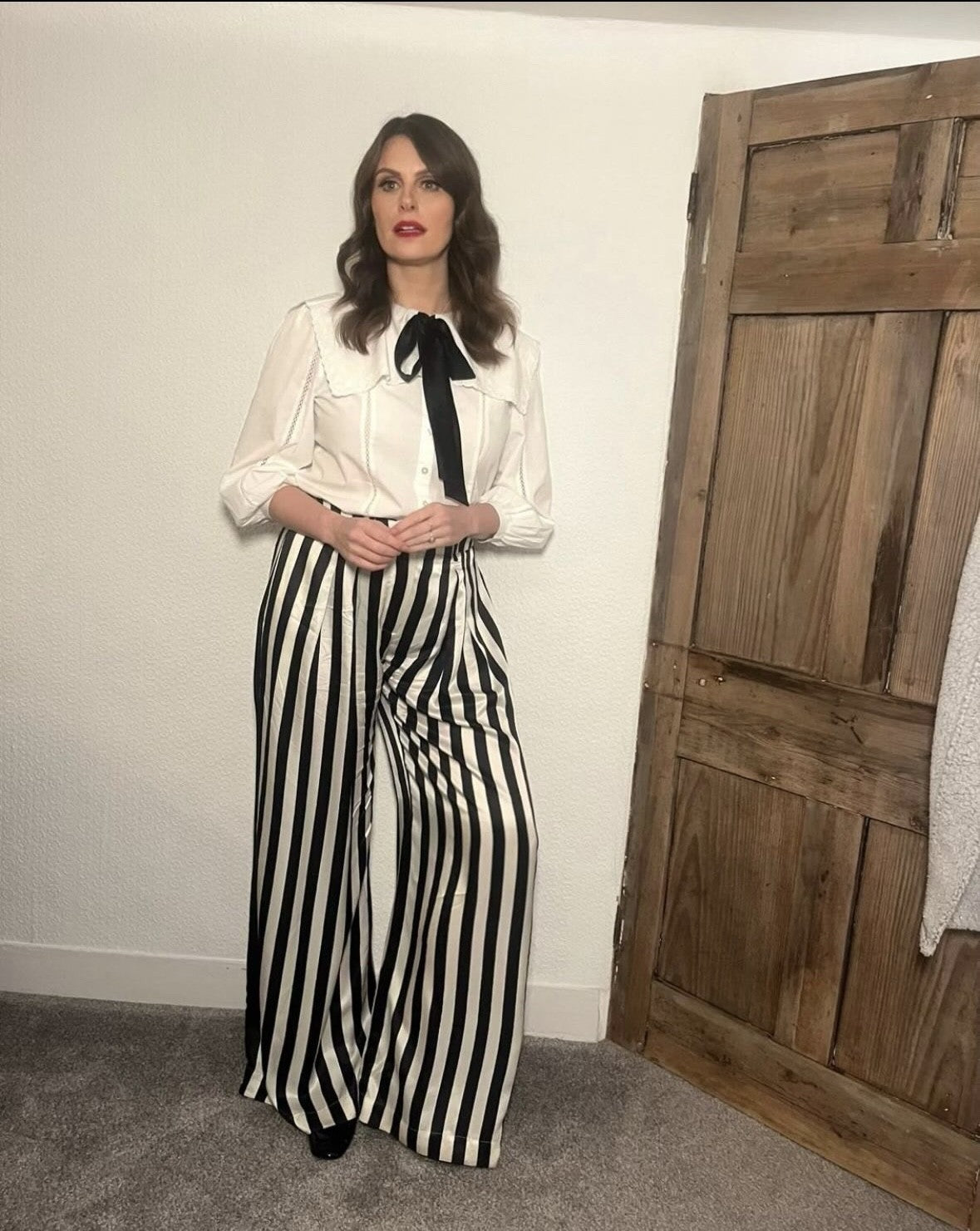 Black and cream striped silk blend wide leg trousers with zip fly and pockets