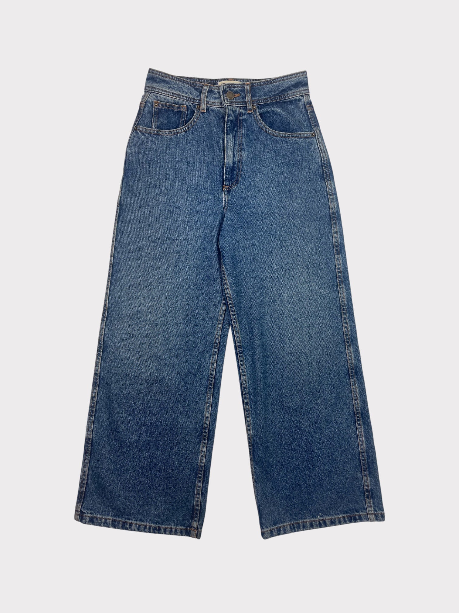 Blue wide leg ankle grazer jeans with zip fly and pockets