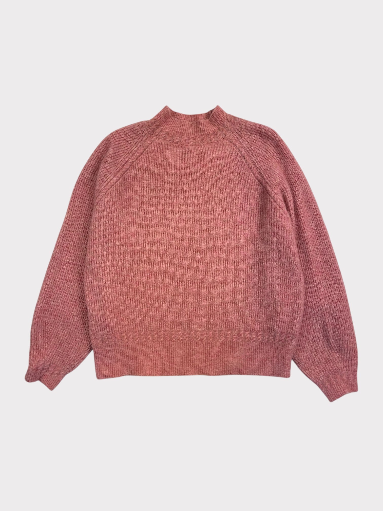 Pink marled knitted jumper with high neck and cable detail around neck hem and on raglan seam