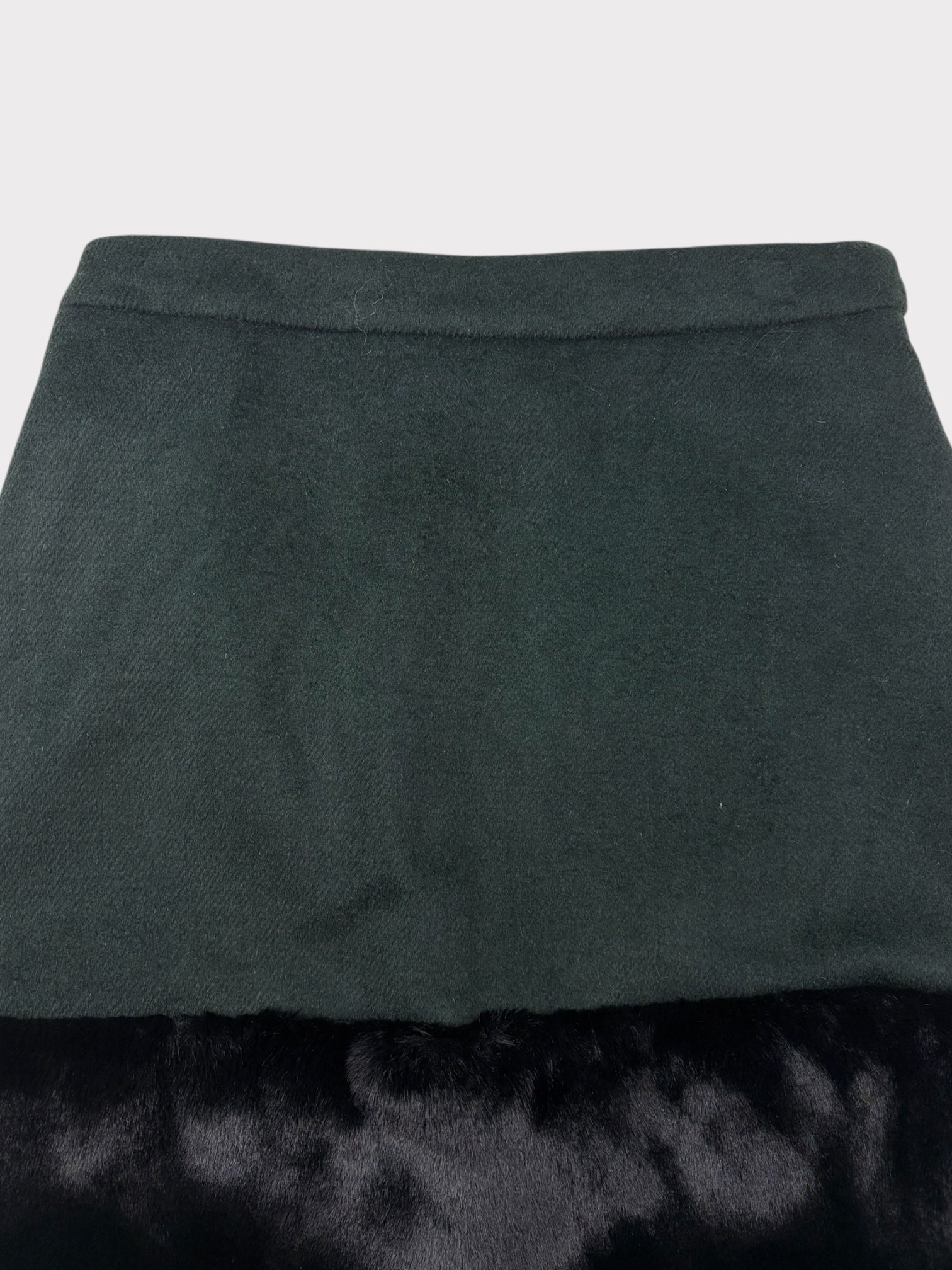 Dark green wool blend mini skirt with black faux fur trim around hem