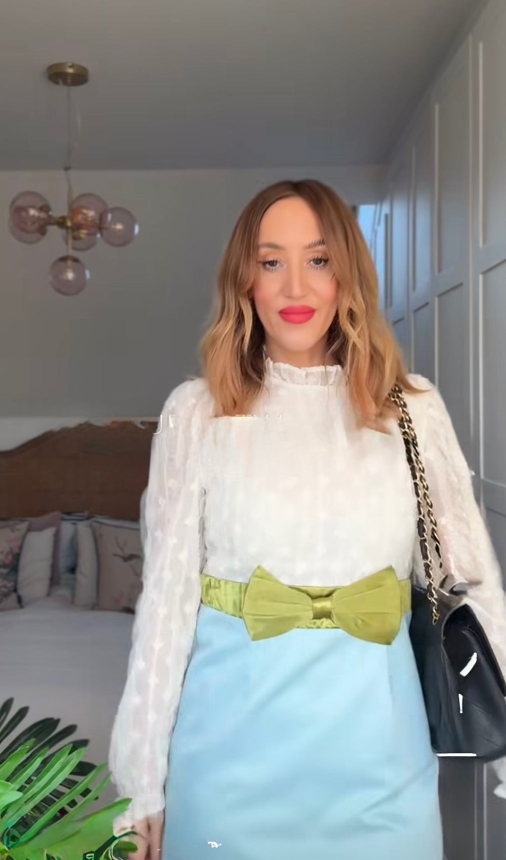 Cream textured tulle dress with contrasting blue skirt and olive green satin bow detail at waist