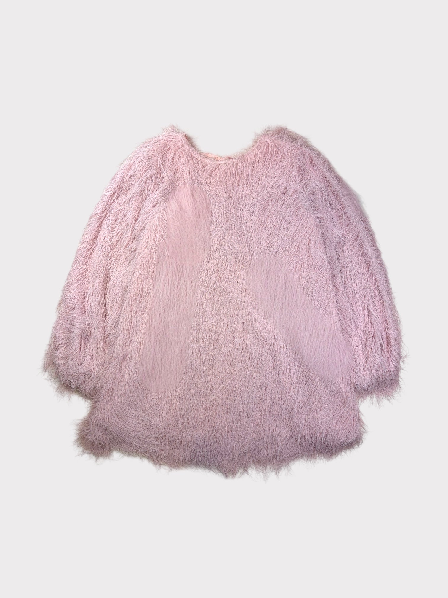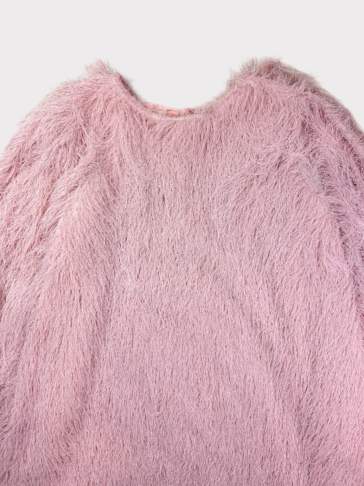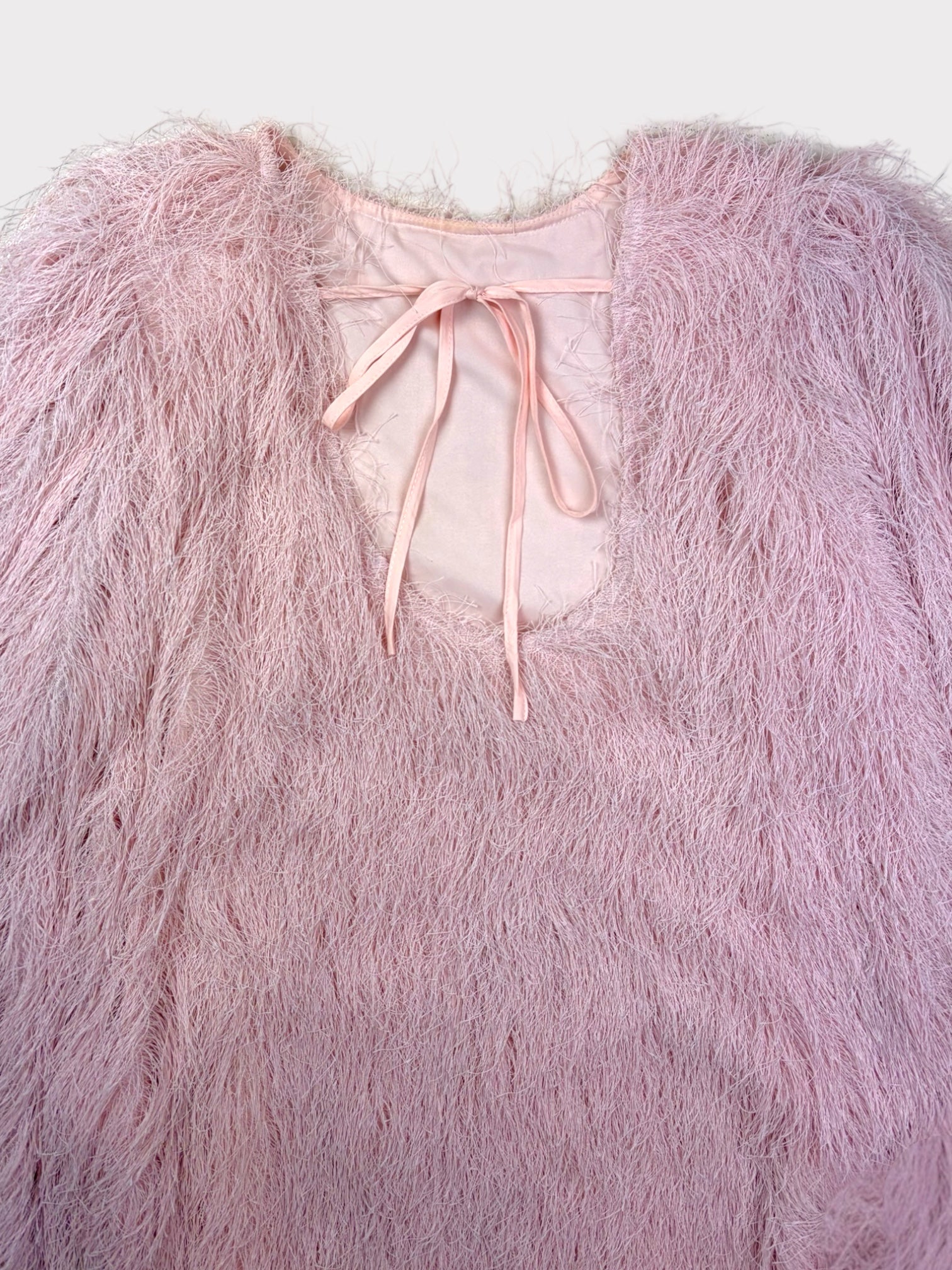 Light pink eyelash fringed mini dress with long sleeves and low back with tie detail