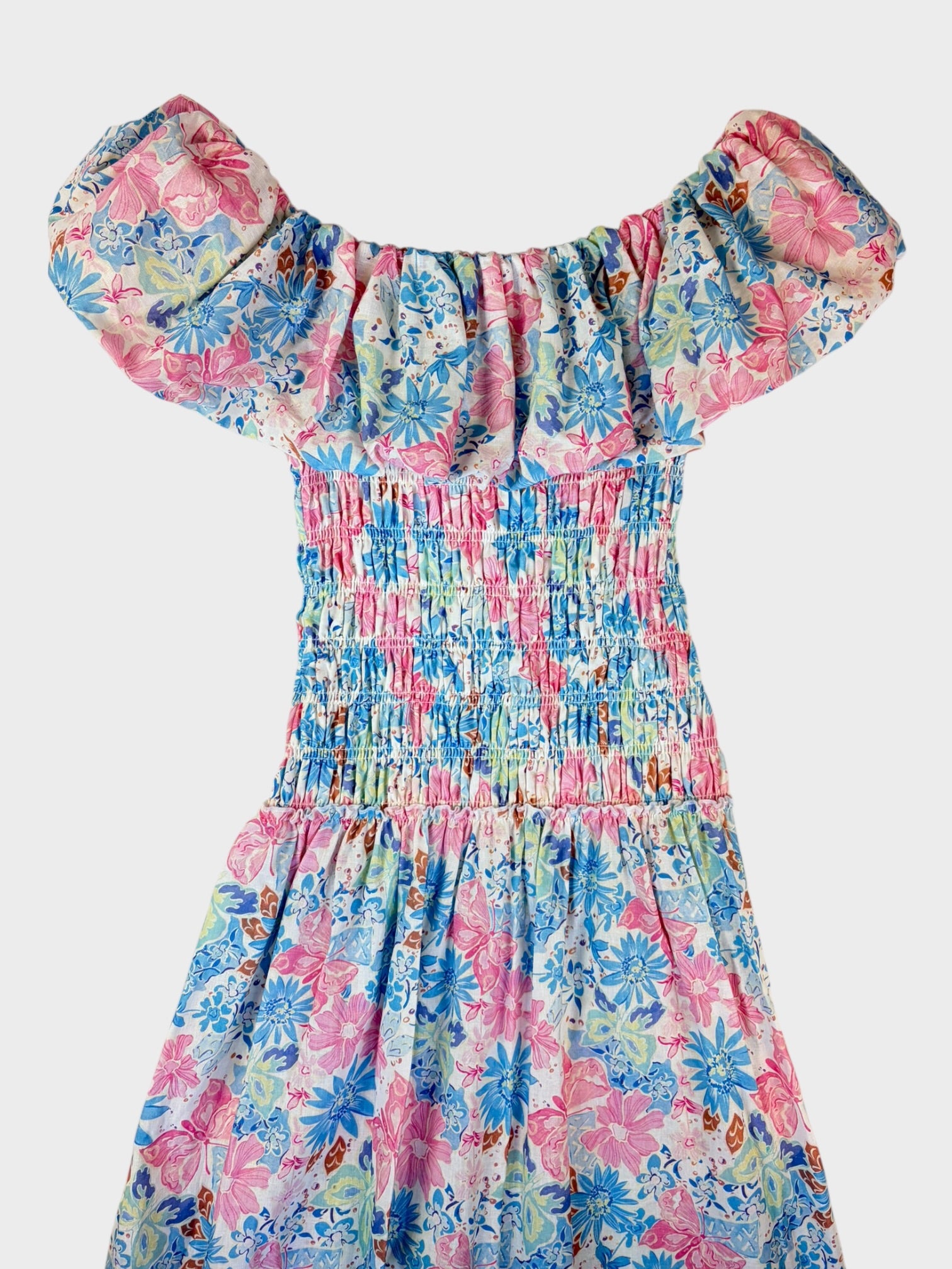Pastel floral linen blend midi dress with smocked bodice and frill detail around shoulders