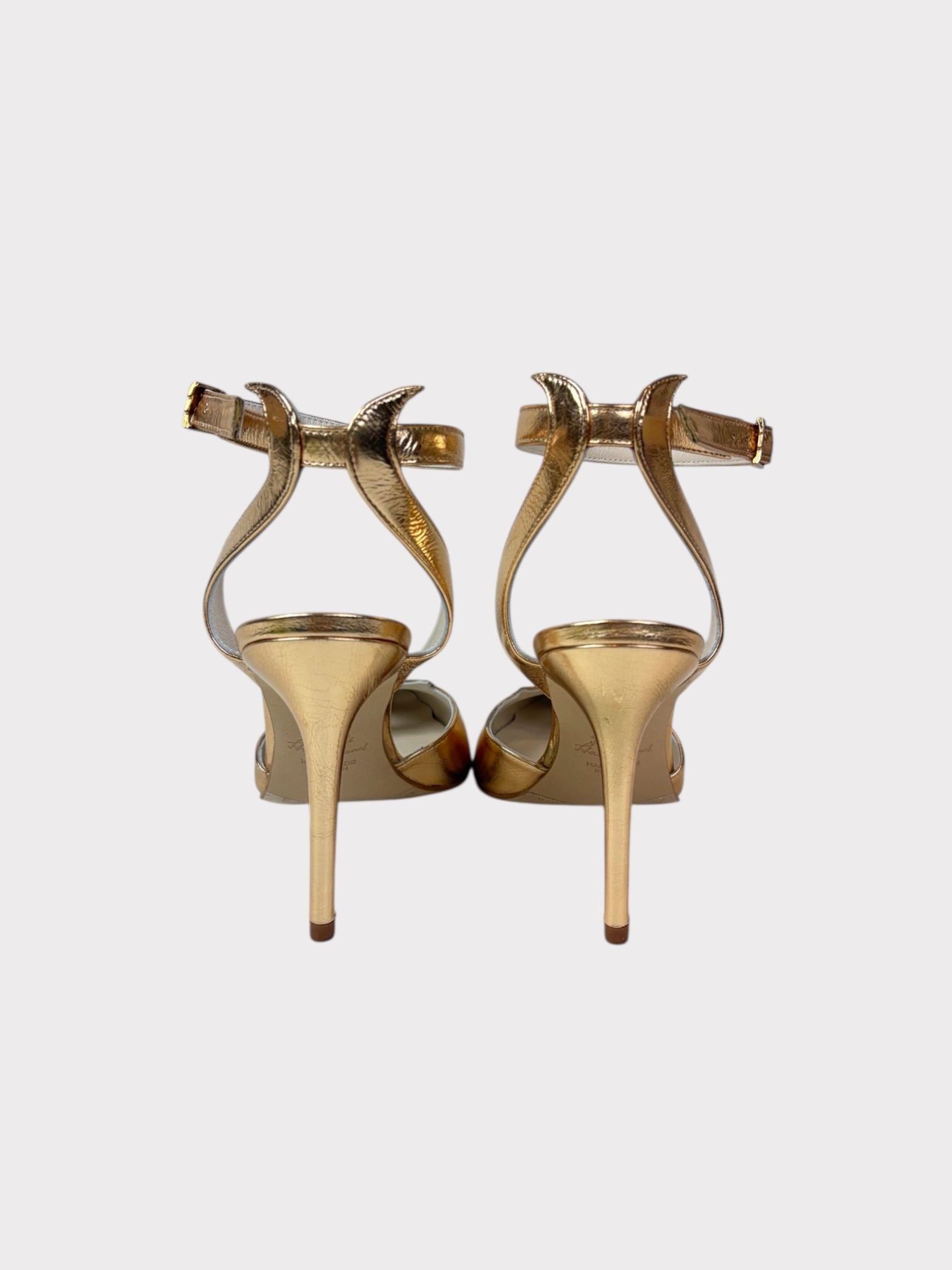 Metallic gold pointy shoes with cut out detail and ankle strap