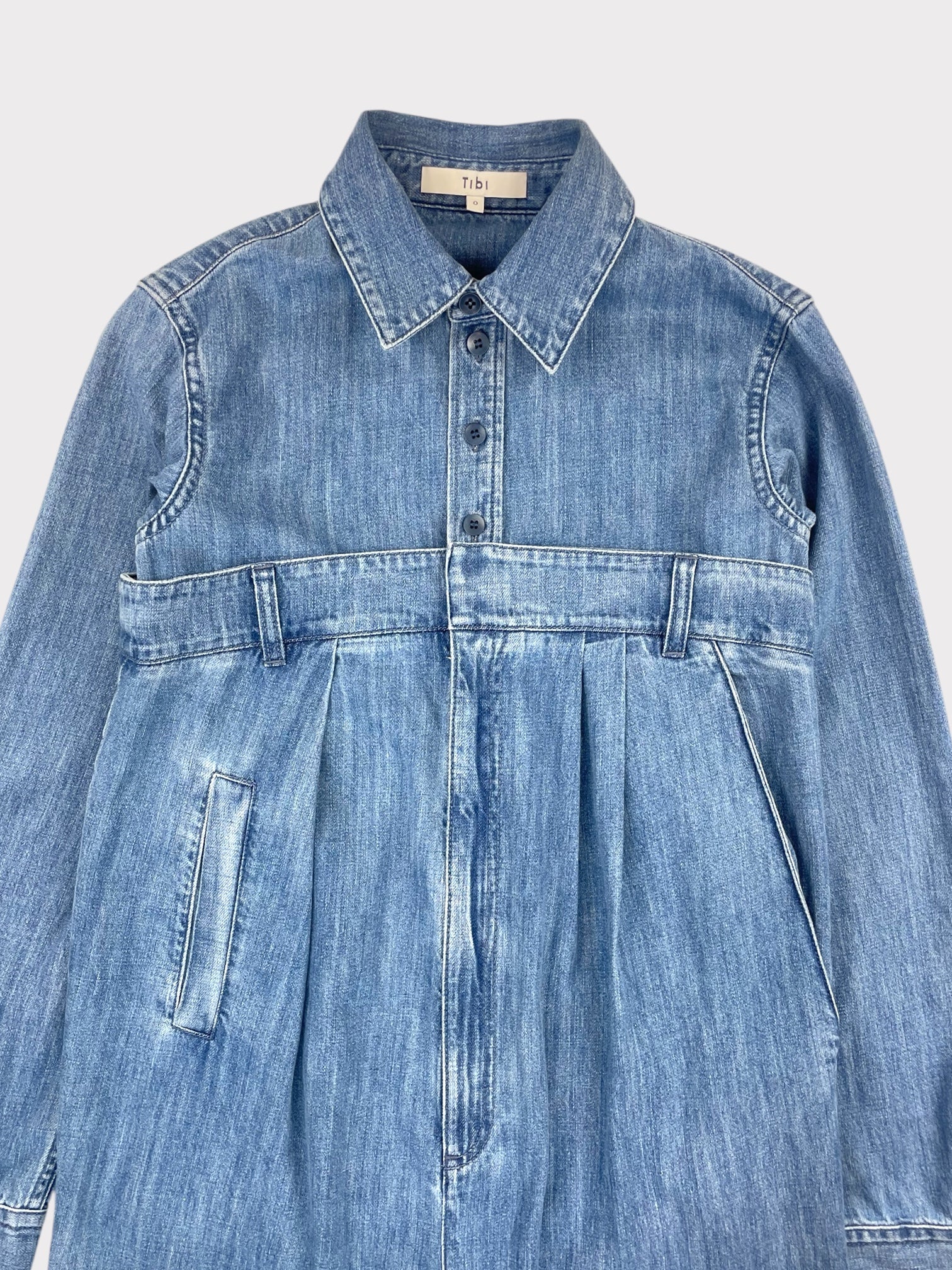 Denim wide leg jumpsuit with faux high waistband detail and pockets
