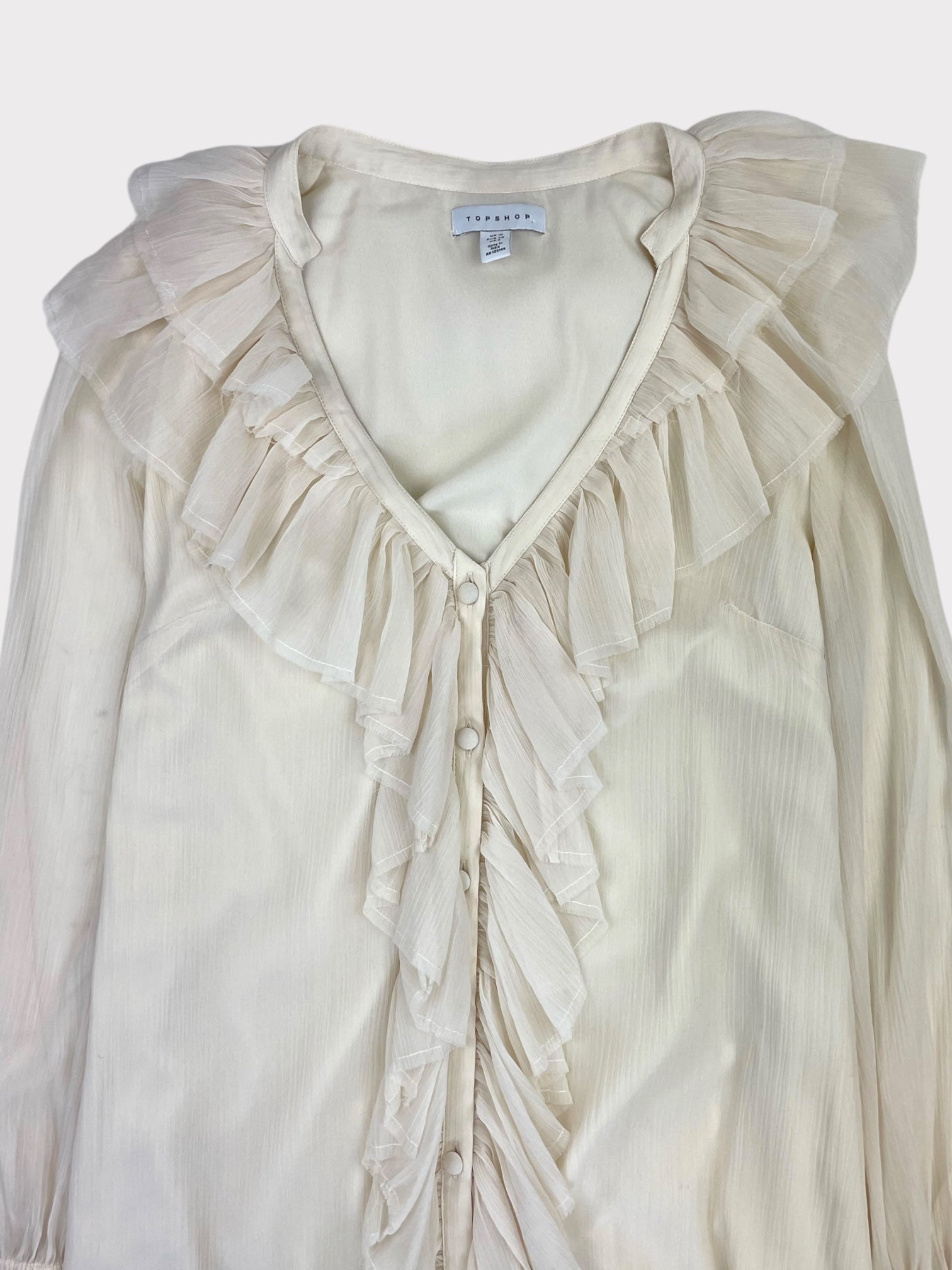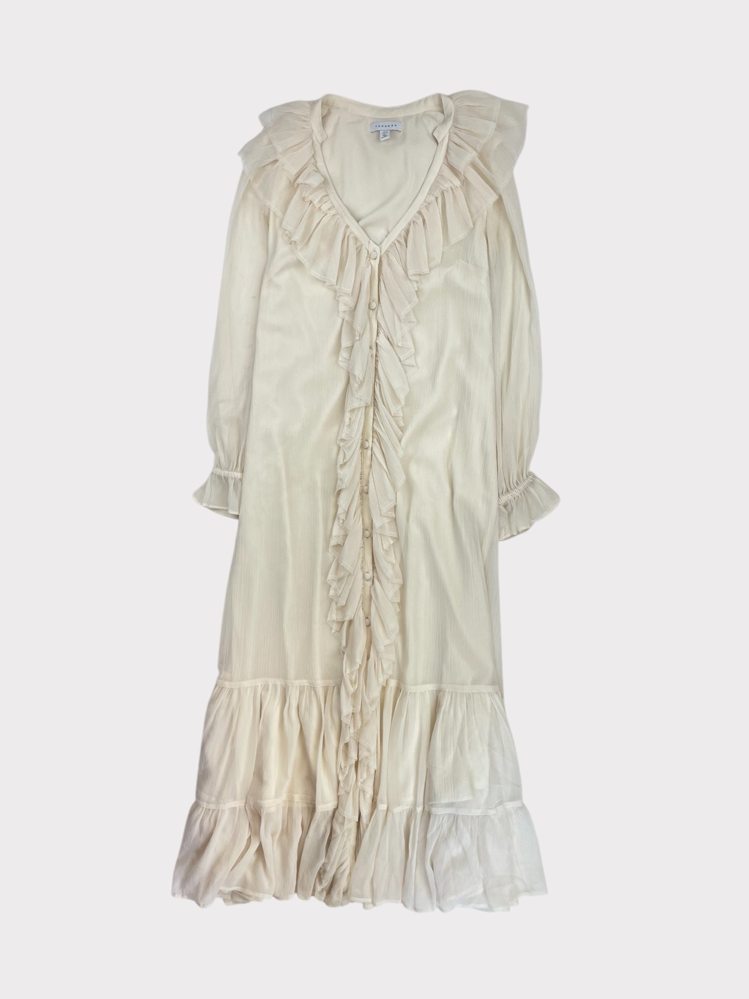 Cream crinkle fabric button up maxi dress with long sleeves and frill details