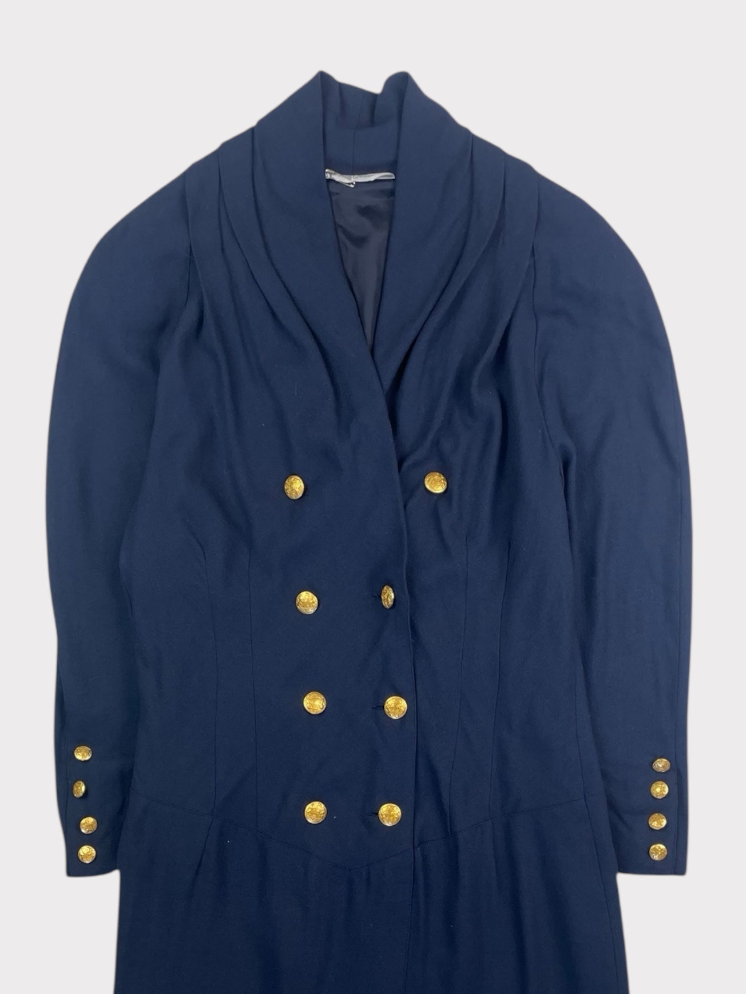 Vintage navy wool blend double breasted dress with gold military buttons by Jean Claire