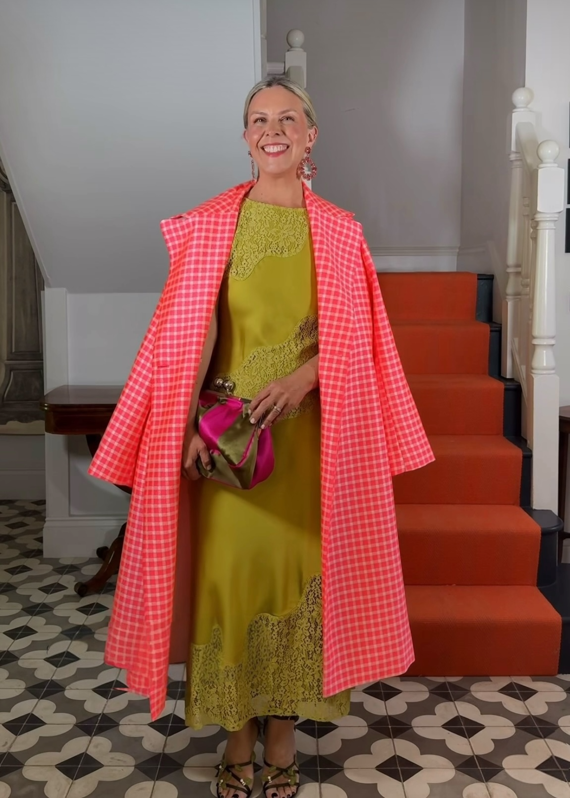 Lime green satin maxi dress with lace panel details