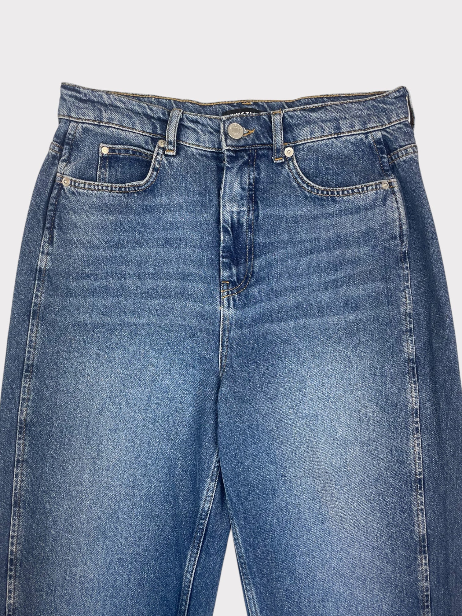 Mid blue denim high waisted jeans with tapered leg and dye effect at thighs