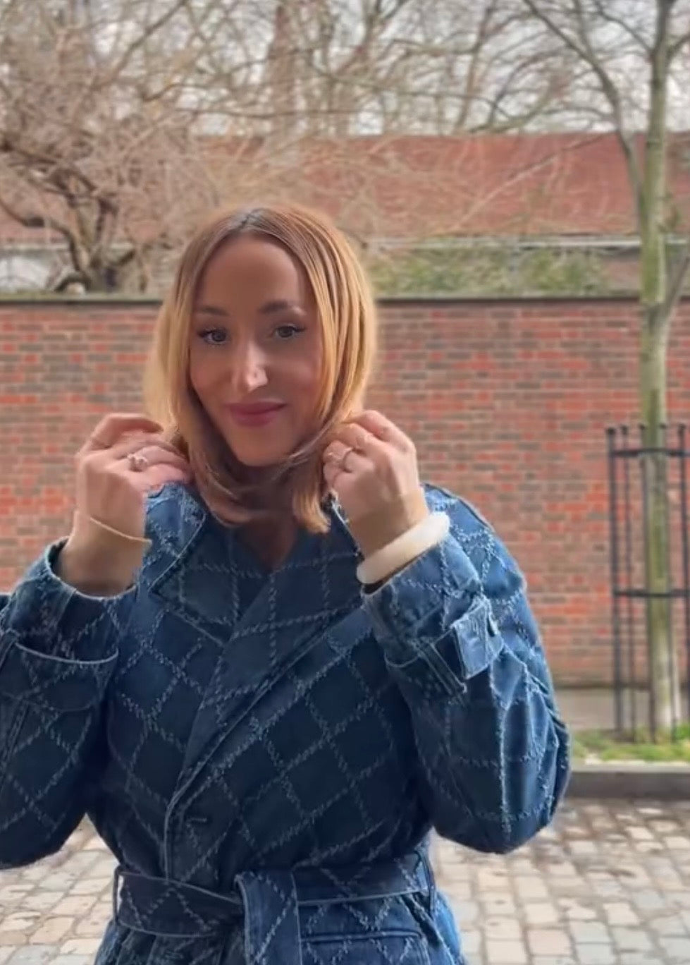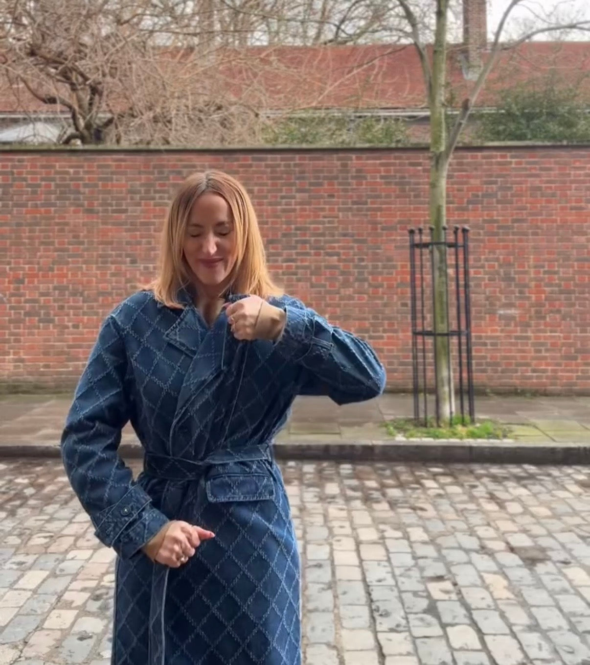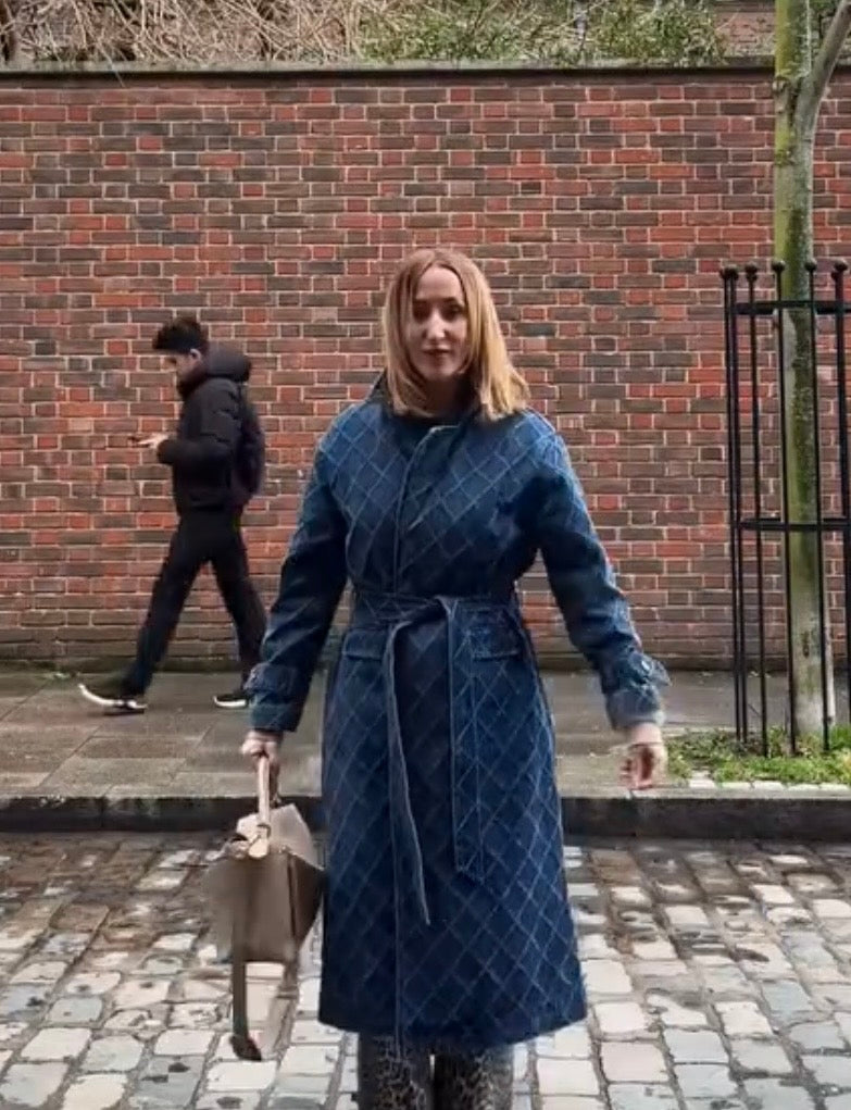 Dark blue denim midi length trench coat with all-over textured diamond pattern