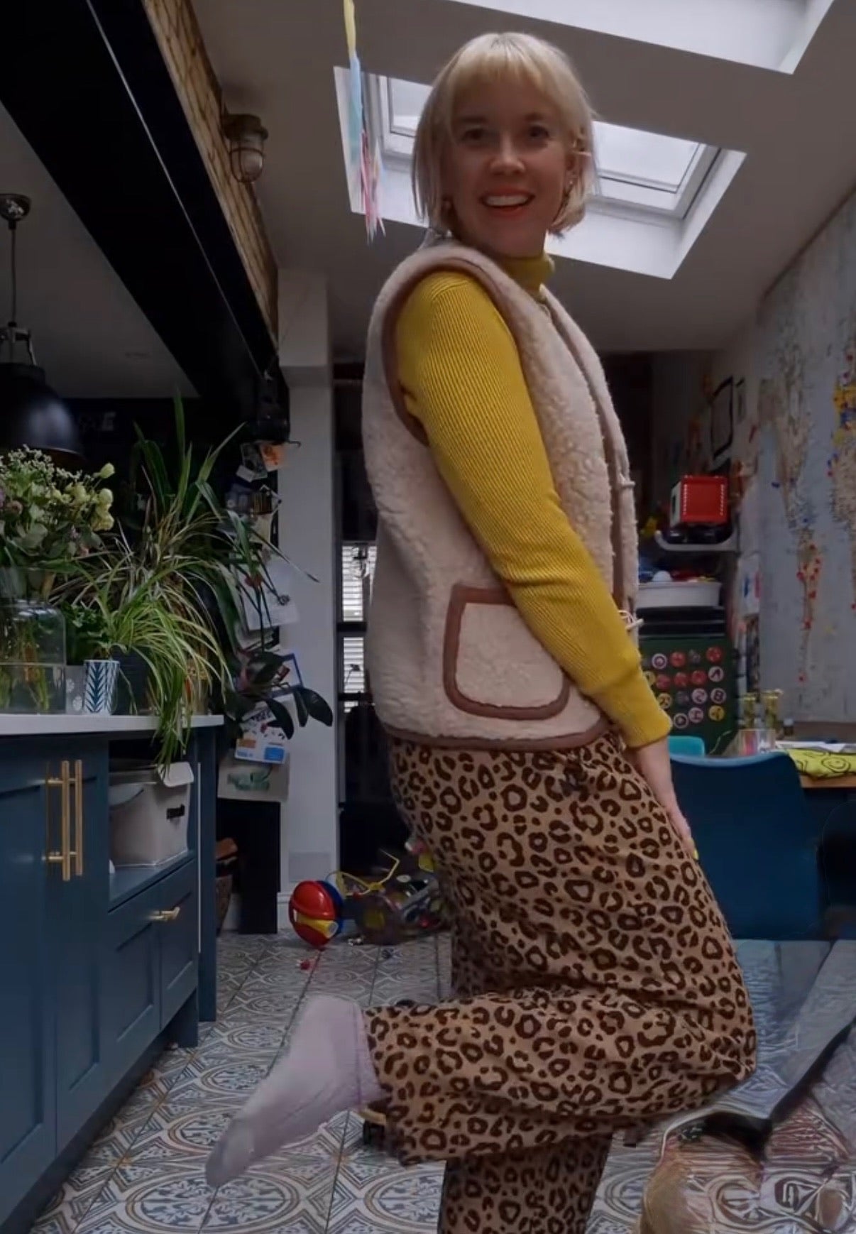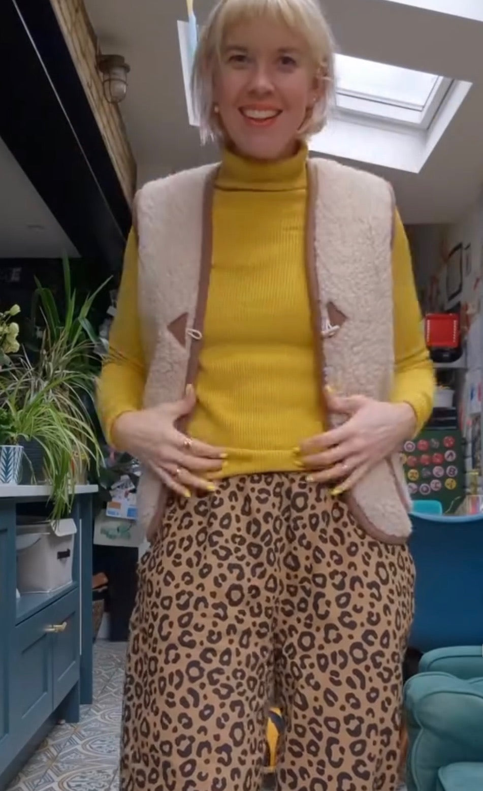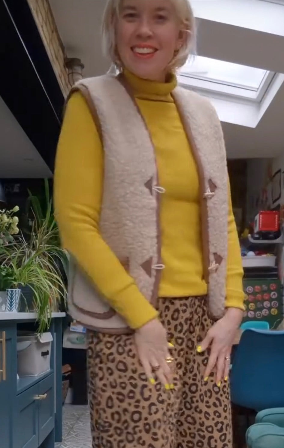 Cream sherpa fabric gilet with brown jersey binding around edges and pockets
