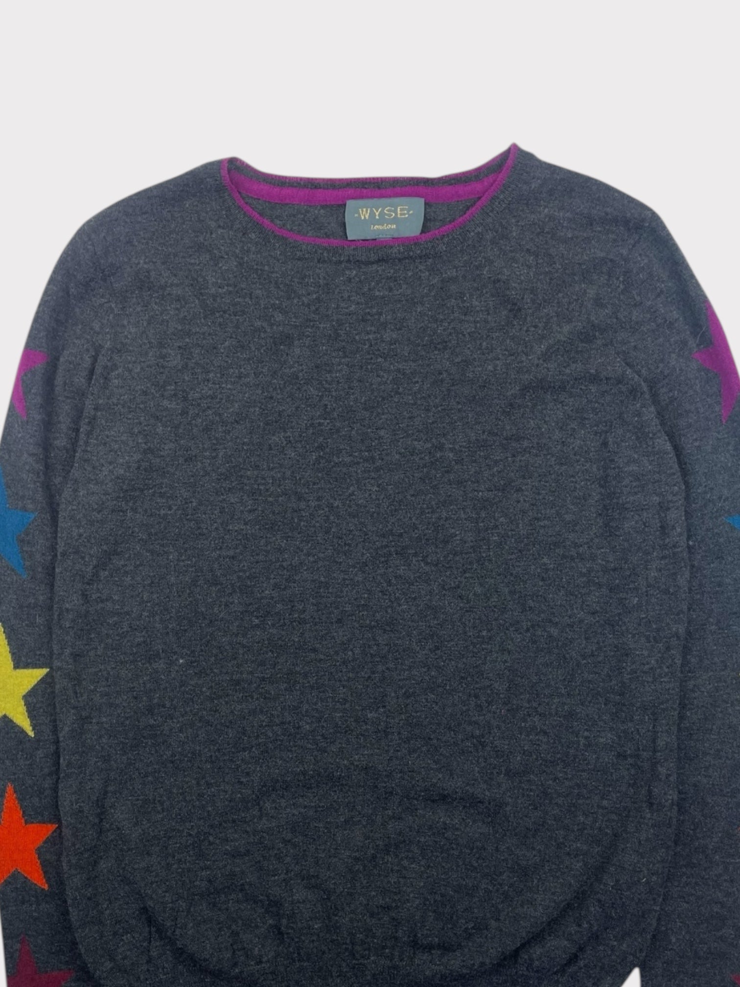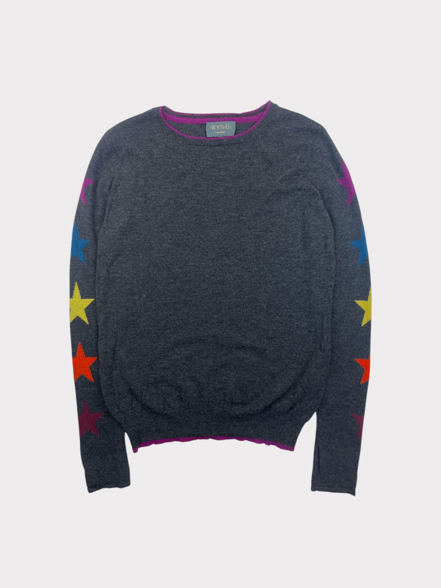Fine knit jumper with contrasting edging at hem and cuffs and colourful star design on sleeves