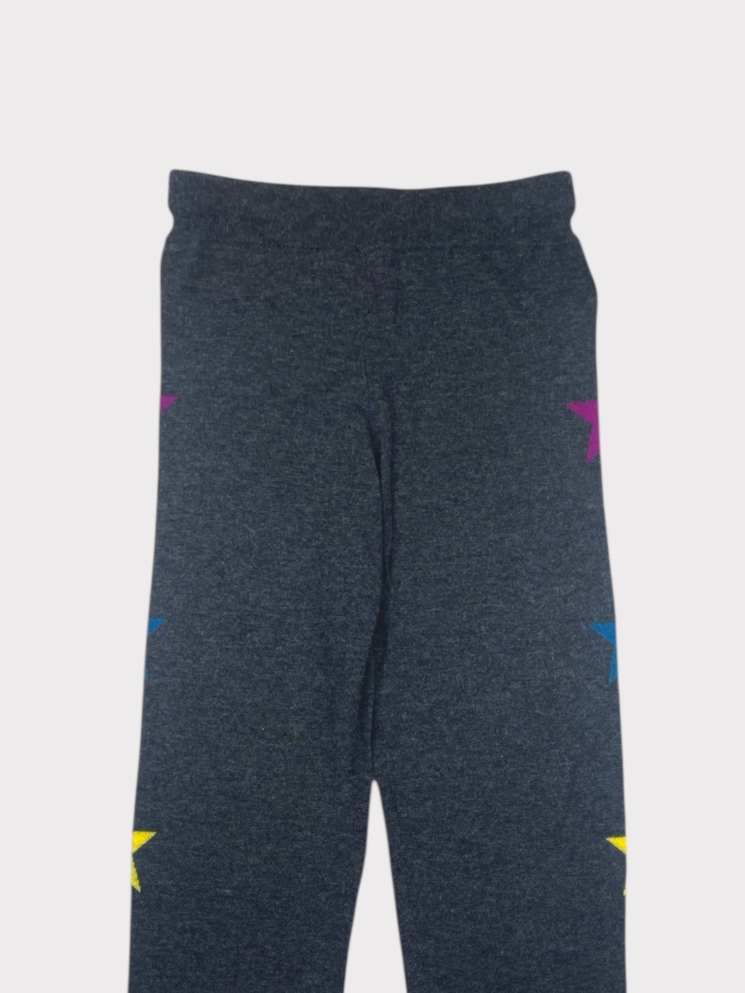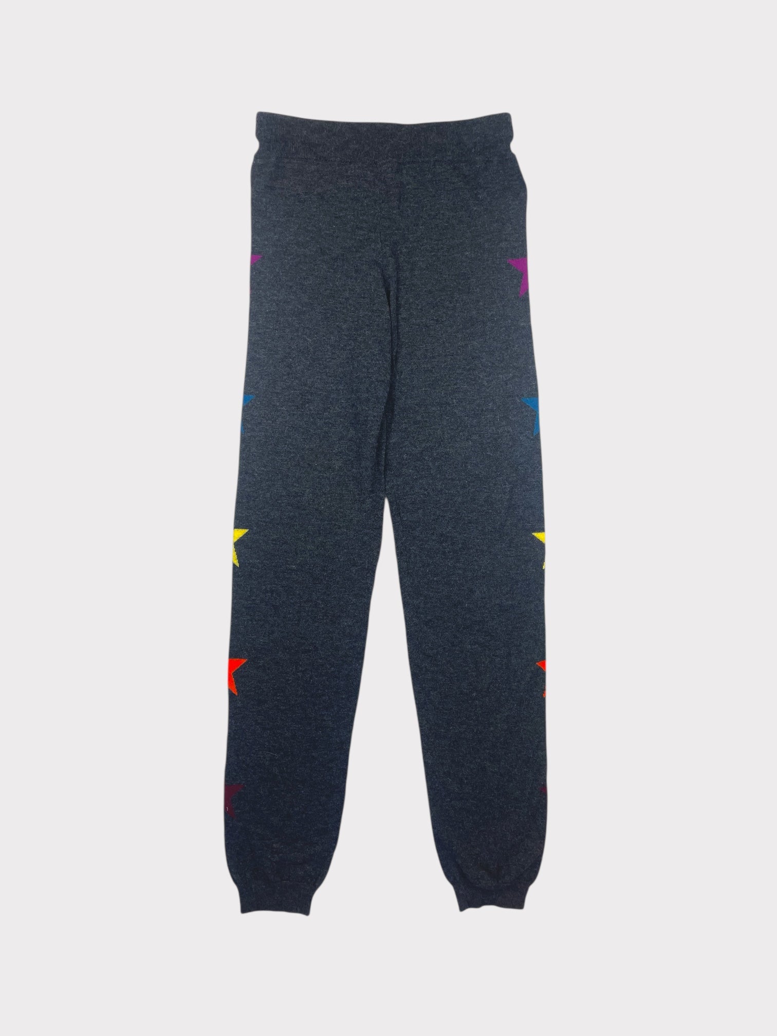 Matching fine knit slim fit joggers with rib cuffs at ankles and colourful star design down legs