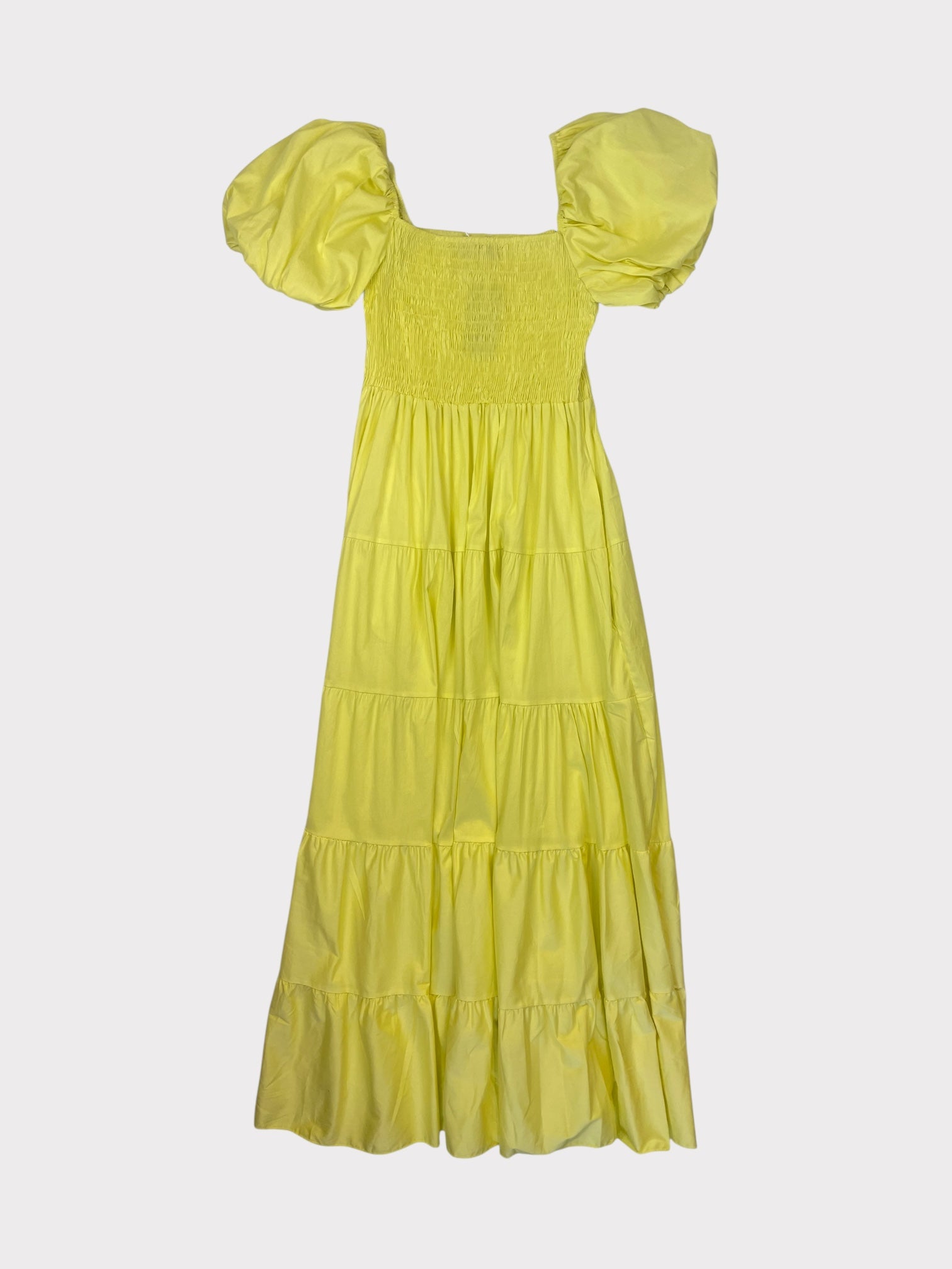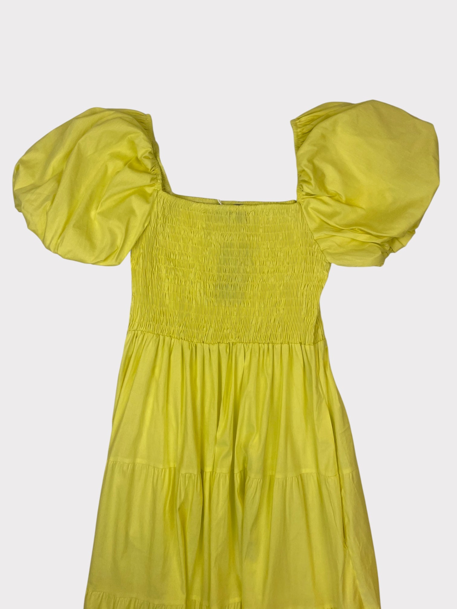 Yellow shirred midi dress with smocked bodice and short puff sleeves