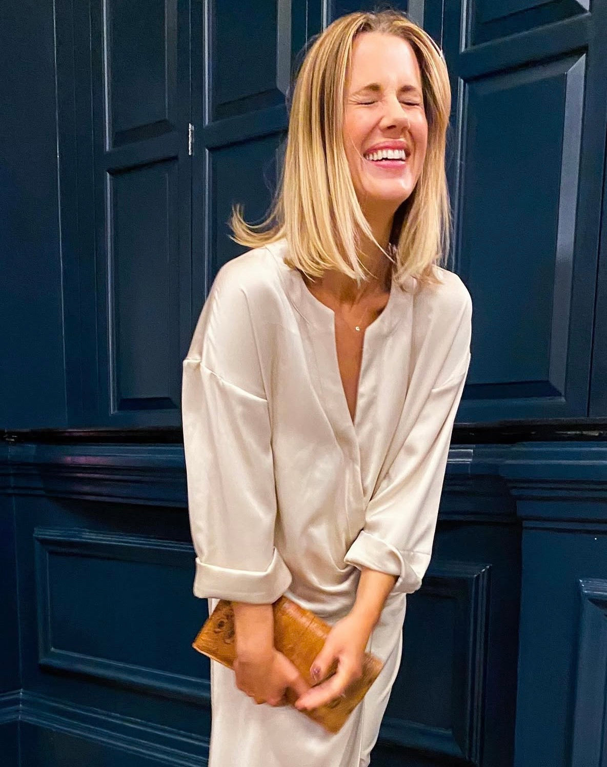 Champagne satin wrap detail dress with 3/4 length sleeves with roll-up detail