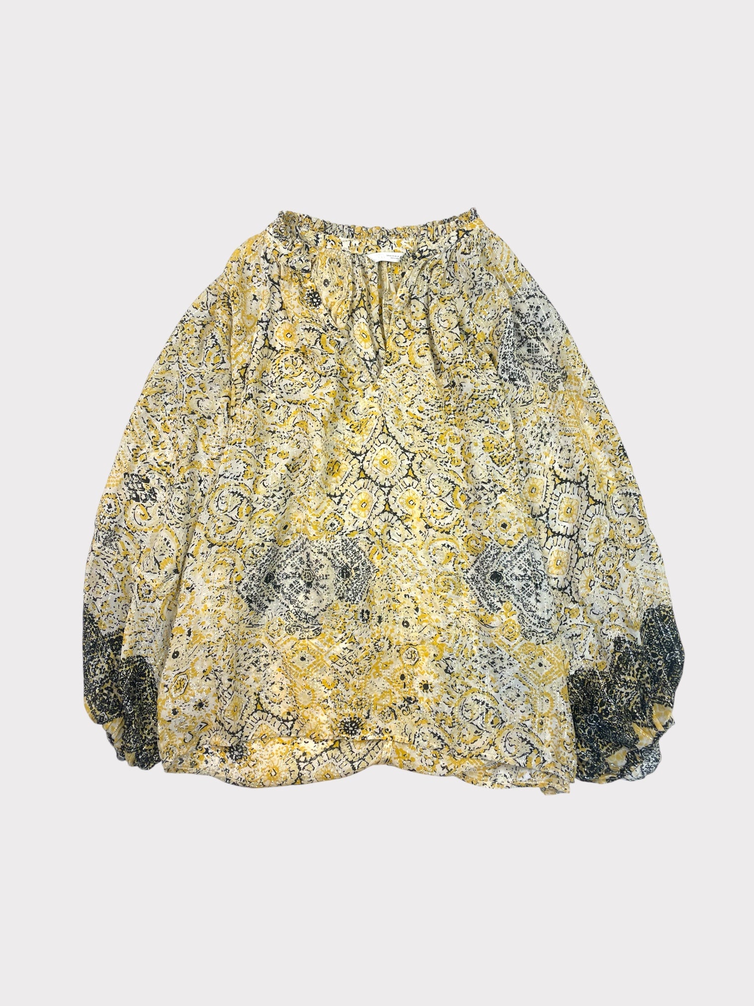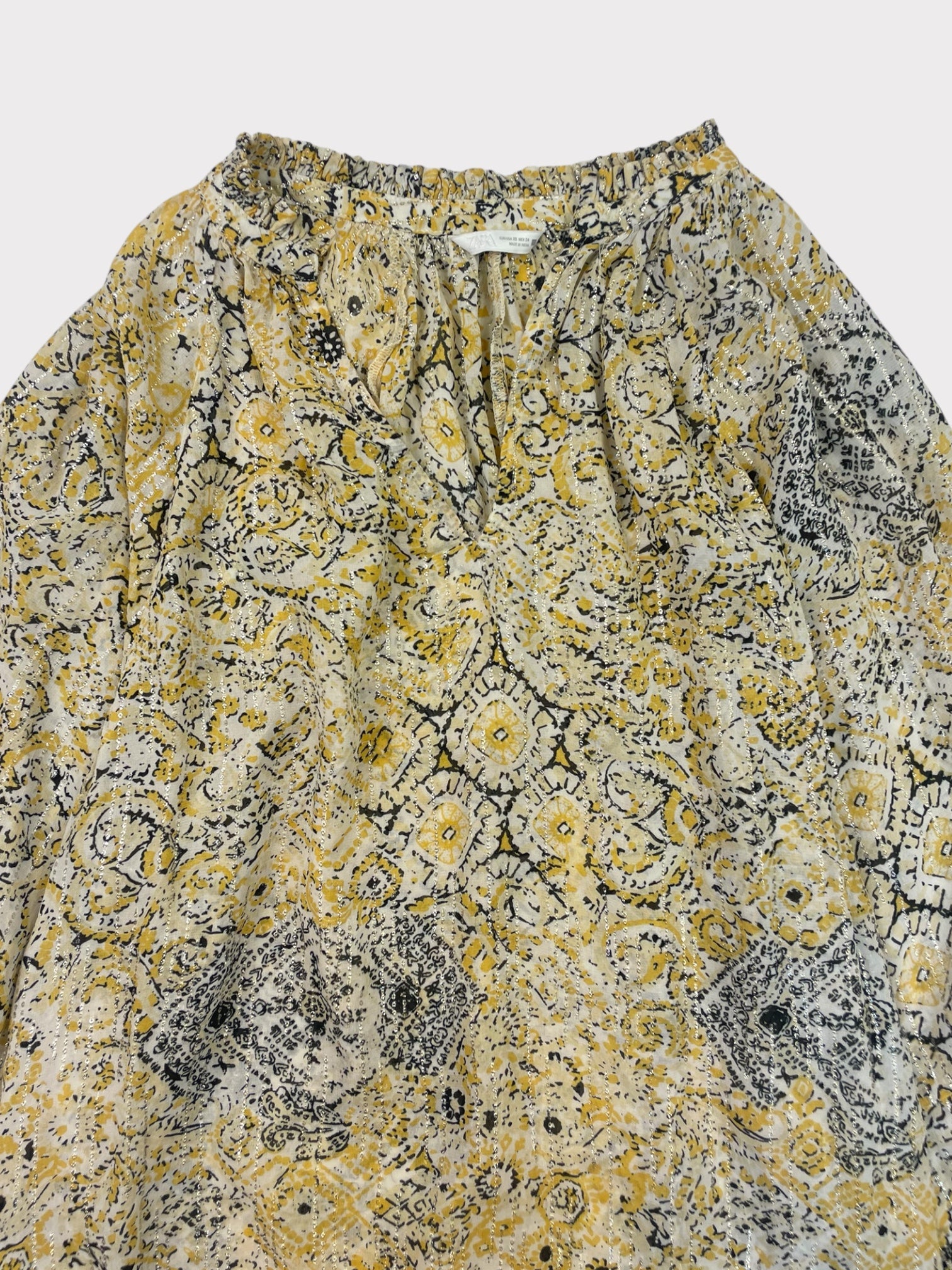 Cream top with black and yellow print and silver metallic thread running through